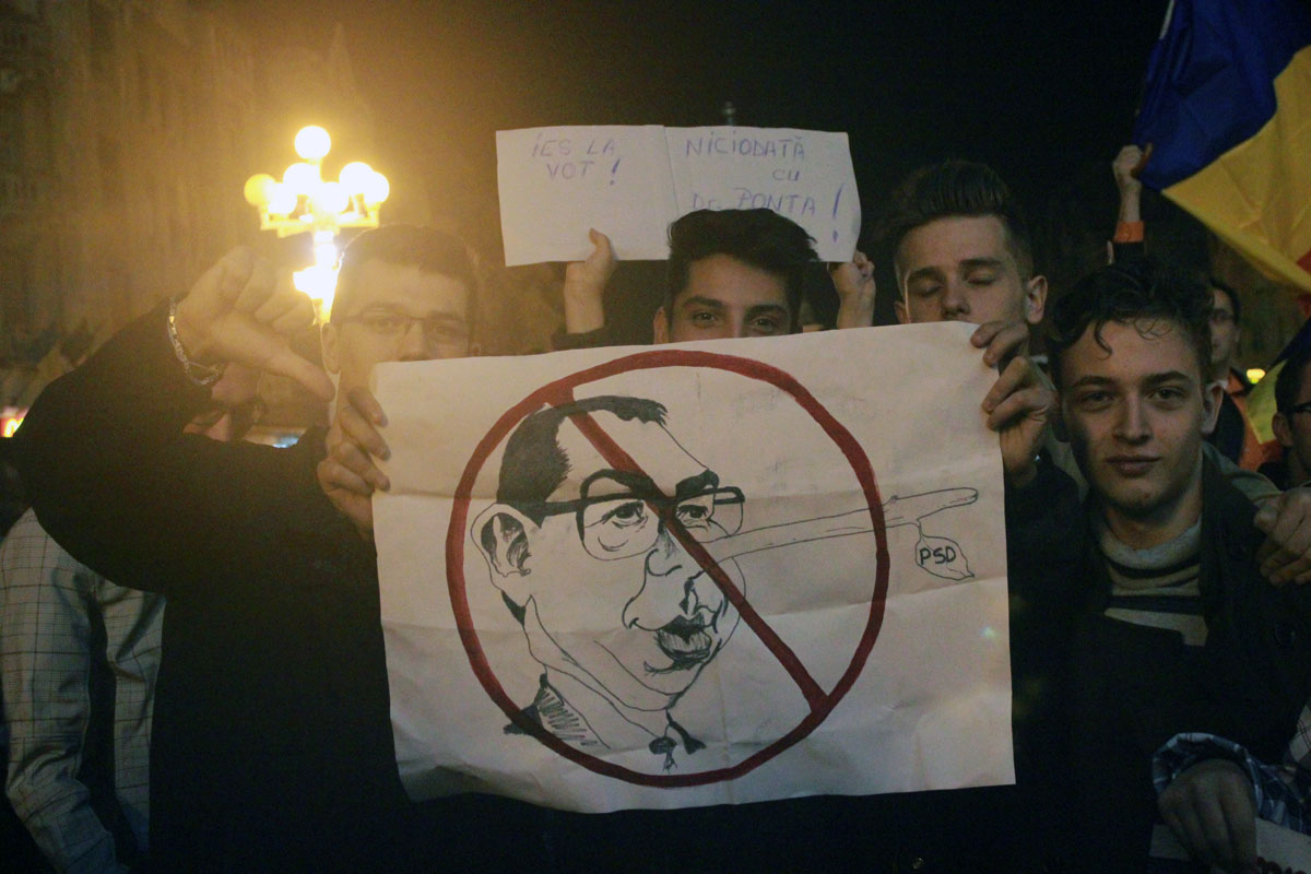 Cei prezenți în Piața Operei au cântat imnul României și au ținut un moment de reculegere în memoria celor care au murit în Decembrie 1989. Cei care s-au aflat mai în spate nu au auzit îndemnul celor care au vorbit la microfon și au început să strige „Jos Ponta”. Protestul a fost unul cu cântec. De câteva ori, muzicianul Cristian Cazacu a fredonat versurile „Hei, hei, nouă ne pasă, nu vom sta în casă”, iar participanții au cântat cu el. Deși protestatarii au strigat lozinci împotriva premierului Victor Ponta, organizatorii nu au rostit niciun cuvânt în acest sens, ci au încurajat mulțimea să strige „Români, suntem cu voi” sau „Timișoara”. „Toți am venit aici pentru că suntem anti-Ponta”, a urlat un alt protestatar, iar după doar câteva momente, organizatorii au uitat despre ce le vorbeau oamenilor la începutul mitingului și au început să încurajeze mulțimea să strige „Jos Ponta”, „DNA, curățenia și pe Ponta îl ia”, „Vrem să votăm, nu să plagiem” sau „Ponta, nu uita, ești pe lista DNA”. Nu au lipsit scandările „Iohannis, Iohannis”.