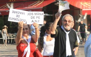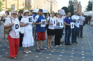 Piața Operei din Timișoara a fost câmp de confruntare între demonstranții anti-USL, mulți dintre ei membrii PDL veniți la promenada civică în frunte cu Constantin Ostaficiuc, și câțiva revoluționari anti-băsiști, nucleul dur al celor care-n iarnă au manifestat împotriva președintelui. Vreo 300 de timișoreni înarmați cu panglici albe și mesaje de sezon – „Pierdut plagiat, Bucureşti, zona Kiseleff, nr.10, găsitorului îi închid gura”, „Jos mâna de pe CNSAS”, „Jos mâna de pe DNA”, „Ponta nu plagia dictatura comunistă”, „Aţi suspendat democraţia – au plecat tăcuţi la plimbarea protest prin centrul Timişoarei, puţin după ora 18 În primele rânduri, membri ai Societăţii Timişoara. Mai în spate, pedeliştii.