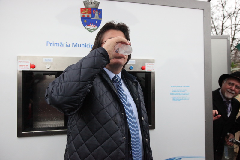 Mare vâlvă astăzi în zona Girocului, unde câteva zeci de cetăţeni s-au înghesuit în ciuda ploii năpraznice de afară pentru a-l vedea pe primarul Nicolae Robu cum inaugurează o instalaţie de apă. Sistemul oferit de o firmă specializată în domeniu oferă în regim de dozator trei tipuri de apă – apă normală, apă normală rece şi sifon. Instalaţia va fi găzduită gratuit vreme de o lună pentru a vedea exact cum este receptată de populaţie. Firma va purta discuţii apoi discuţii cu municipalitatea. Edilul şef a subliniat însă că sub nicio formă primăria nu ar achiziţiona astfel de instalaţii care ar costa aproximativ 8.000 de euro. Ajuns cu douăzeci de minute întârziere la faţa locului, Robu a discutat cu reprezentanţii firmei, a dat voios declaraţii presei, după care, poftit să guste din apa filtrată, a comandat apă plată normală.