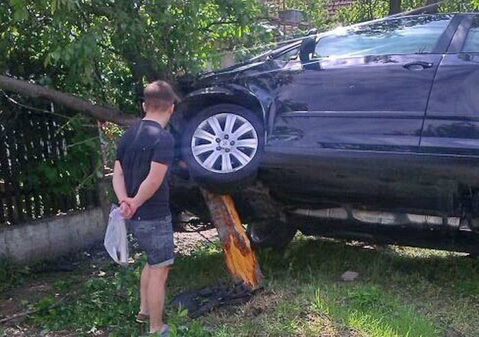 Un şofer imprudent s-a căţărat cu maşina-n pom. Vezi cum a reuşit FOTO