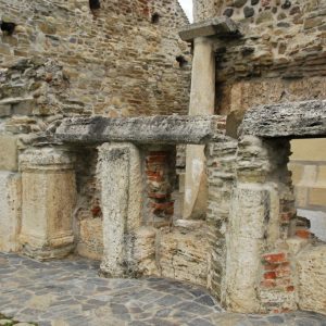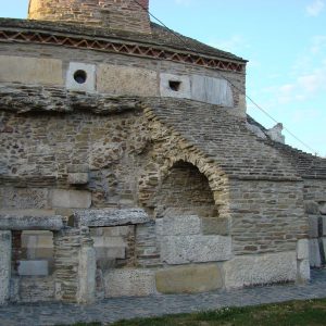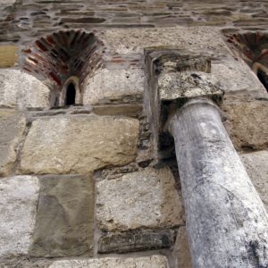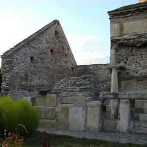 Pereţii au fost construiţi din stele funerare, sarcofage, coloane şi pietre cu inscripţii romane. Masa de altar e piatra funerară a unui ofiţer roman, gurile de canal au fost transformate în ferestre, iar cărămizile cu ştampile au devenit frize, stâlpii din biserică au fost construiţi din pietre funerare romane suprapuse. Leii funerari au fost folosiţi ca elemente de decor pe acoperiş, iar coloanele romane de pe latura de nord şi sud care par să aibă rol de contraforţi au fost folosite tot ca piese ornamentale. În secolele XIV-XV, pe latura sudică au fost adăugate şi alte încăperi, totul într-o manieră unică, imposibil de încadrat în vreun stil arhitectonic, chiar dacă criticii de artă au identificat o amprentă a romanicului târziu, completată ulterior cu elemente gotice.