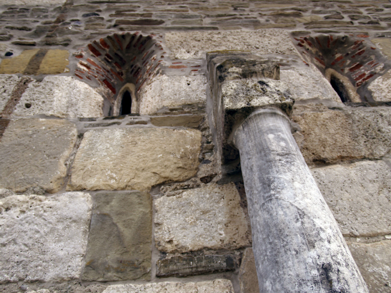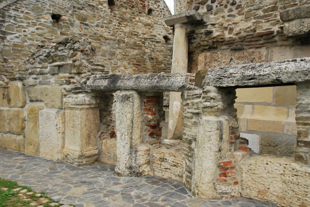 Pereţii au fost construiţi din stele funerare, sarcofage, coloane şi pietre cu inscripţii romane. Masa de altar e piatra funerară a unui ofiţer roman, gurile de canal au fost transformate în ferestre, iar cărămizile cu ştampile au devenit frize, stâlpii din biserică au fost construiţi din pietre funerare romane suprapuse. Leii funerari au fost folosiţi ca elemente de decor pe acoperiş, iar coloanele romane de pe latura de nord şi sud care par să aibă rol de contraforţi au fost folosite tot ca piese ornamentale. În secolele XIV-XV, pe latura sudică au fost adăugate şi alte încăperi, totul într-o manieră unică, imposibil de încadrat în vreun stil arhitectonic, chiar dacă criticii de artă au identificat o amprentă a romanicului târziu, completată ulterior cu elemente gotice.