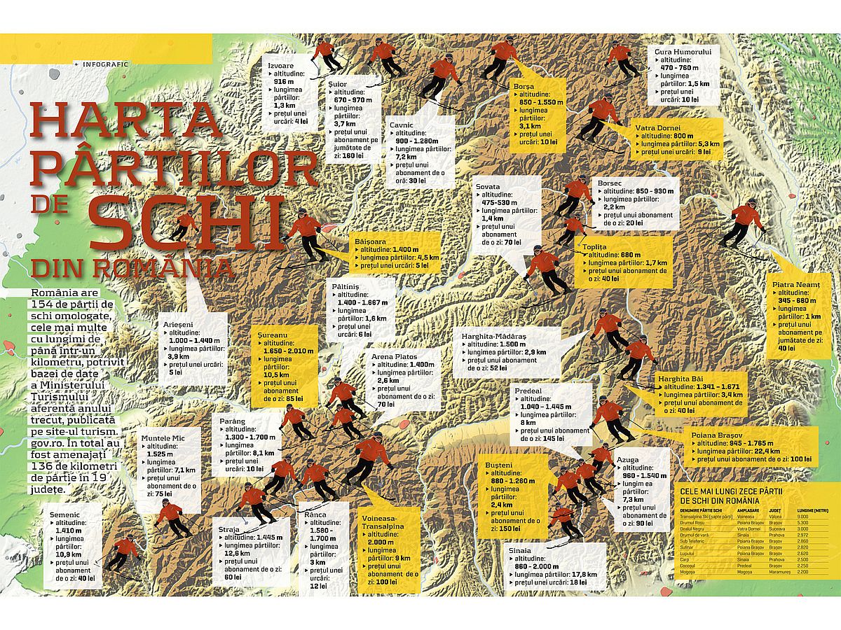 În total au fost amenajaţi 136 de kilometri de pârtie în 19 judeţe. Cele mai lungi 10 pârtii de schi din ţară sunt la Voineasa, Poiana Braşov, Vatra Dornei, Sinaia, Predeal şi Mogoşa.