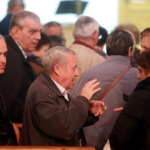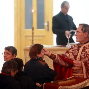 În subsolul bisericii din Piața Sinaia din Timișoara este o liniște aproape de mormânt. Tăcerea este spartă doar de scârțâitul ușii și de cântecele bisericești care abia se aud de sus. 30 de suflete se află în încăpere, așezate pe scaune. Niciunul dintre oamenii prezenți nu par să fie deranjați de sunete. Asta pentru că nu le aud. Credincioșii privesc cu atenție spre partea din față a paraclistului. Imediat, încep să-și facă cruce, iar preotul ridică mâna dreaptă, cu degetul mare în sus, pe care o coboară apoi ușor pe palma stângă. Este semnul pentru „Amin”.