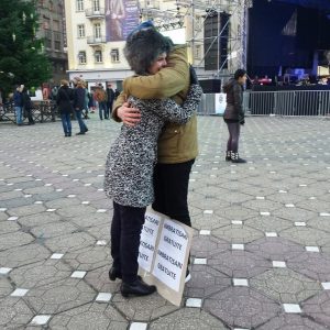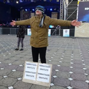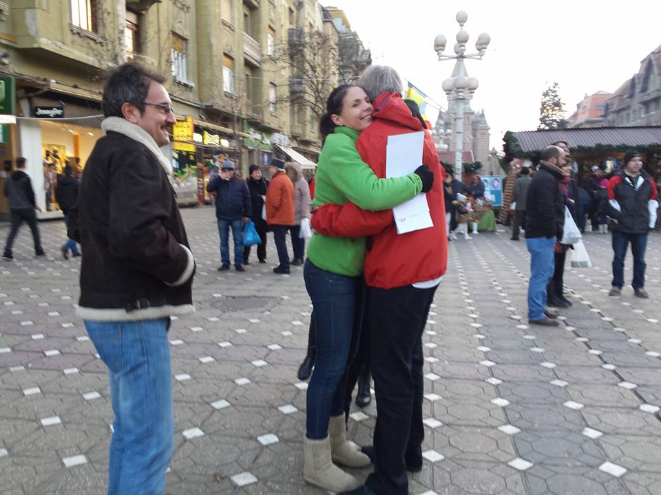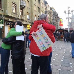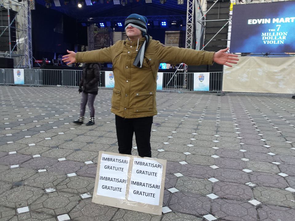 Printre cei care au aflat de acțiune de pe Facebook și au dorit să se implice s-a numărat și Marius Ibănișteanu, student în anul I la Universitatea de Medicină și Farmacie din Timișoara, specializarea Asistență Medicală Generală. Tânărul s-a așezat în fața scenei instalate în Piața Operei cu o pancartă pe care era scris “Îmbrățișări gratuite”, iar legat la ochi și cu mâinile desfăcute, acesta a îmbrățișat timișorenii care s-au aruncat în brațele lui.