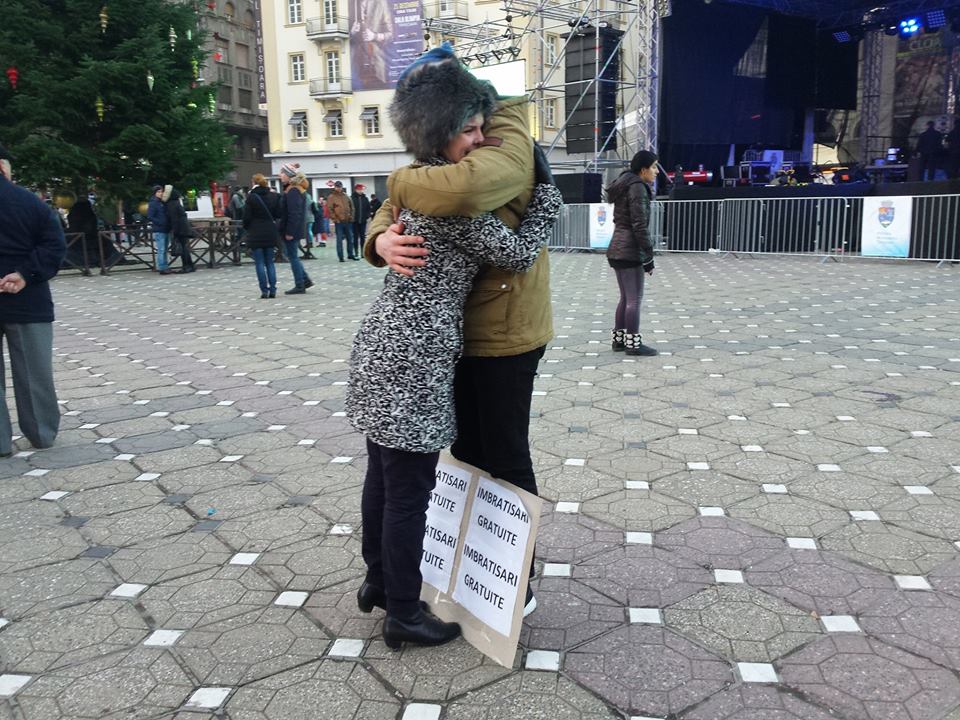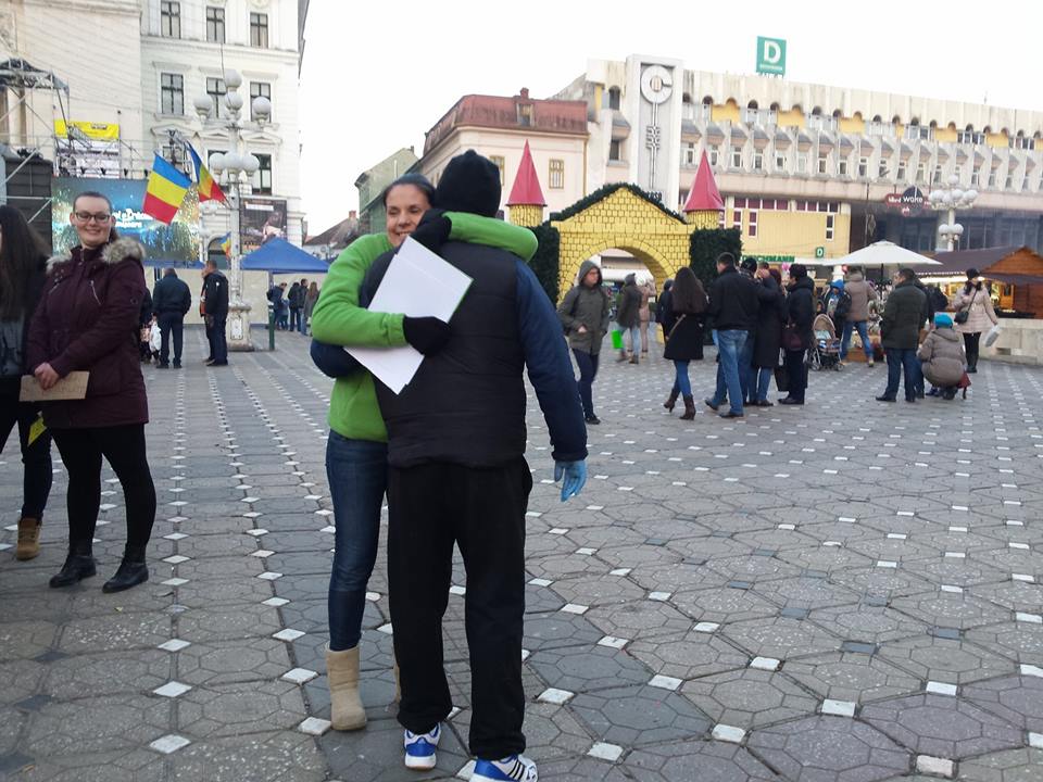 Timișorenii care s-au plimbat, în această seară, prin Piața Victoriei, au avut parte de o surpriză neașteptată. Și anume, o îmbrățișare gratuită primită din partea unei persoane necunoscute. Acțiunea a fost organizată de Asociația Look Inside din Timișoara pentru cel de-al patrulea an consecutiv și s-a bucurat de un real succes. Evenimentul a avut anunțat pe Facebook, în urmă cu câteva zile, astfel că celor 20 de voluntari din cadrul ONG-ului li s-au alăturat alți 50 de timișoreni care au dorit să facă o faptă bună.