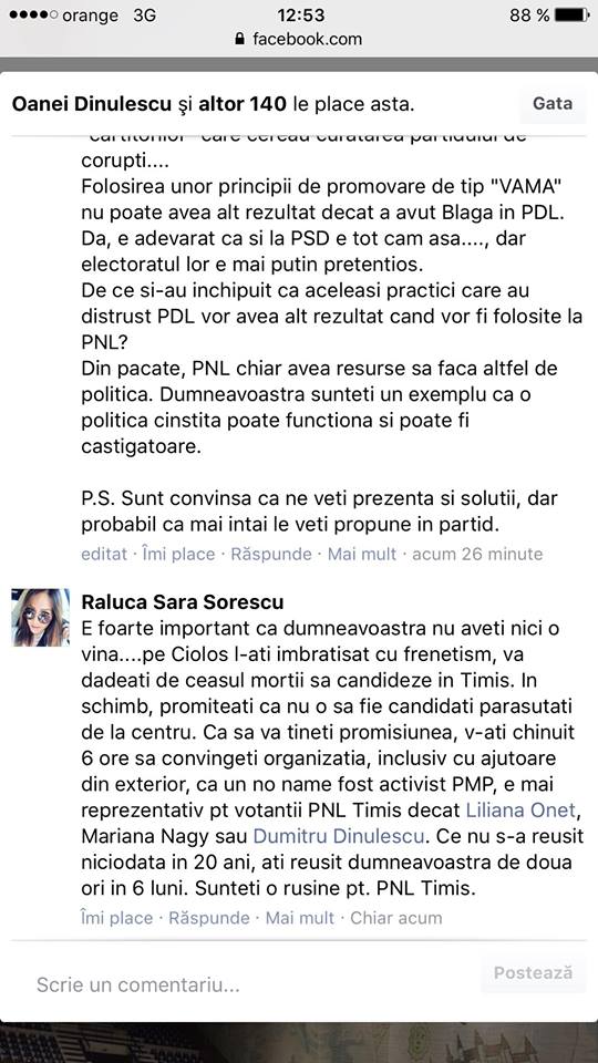 Schimb incredibil de replici între primarul Timişoarei, Nicolae Robu, şi o tânără din Timişoara. Recent edilul timişorean a postat pe Facebook un text în care facea analiza cauzelor care au dus la eşecul PNL în alegeri. Printre altele, Robu critica şi impunerea unor candidaţi de la nivel central pe lista PNL Timiş, dar şi pe listele filialelor din alte judeţe. Vizată direct de atacurile lui Robu era chiar Alina Gorghiu, fostă şefă a PNL, care a candidat pentru un post de senator în Timiş.