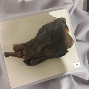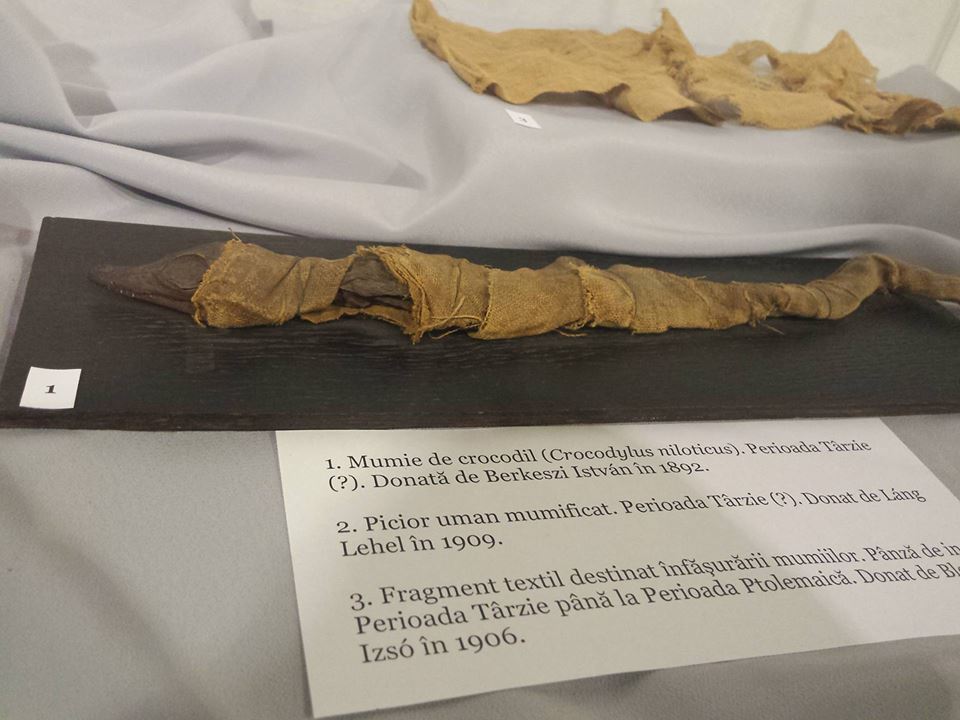 “Sunt expuse 51 de piese din colecția de antichități egiptene a muzeului. Sunt piese deosebit de valoroase. Dar cele mai valoroase piese sunt fragmentele unui sicriu antropoid, datat în timpul dinastiei 21, circa 1.039 î. Hr. Trei fragmente din cele patru ale sicriului sunt prezentate vizitatorilor într-un fel de cameră mortuară simbolică, cu panouri ilustrative de mare detaliu. De departe, zic eu, este o piesă care atrage atenția, mumia unui pui de crocodil. Exista practica la vechii egipteni ca puii de crocodil să fie ținuți o anumită vreme în niște bazine pe lângă templele dedicate zeului Sobek, un zeu care era reprezentat de un cap de crocodil. Iar apoi acești pui erau sacrificați la o anumită vârstă, mumificați, iar apoi mumiile votive erau vândute pelerinilor pentru a fi oferite ca ofrandă la altarul respectiv”, a explicat Nicoleta Demian.