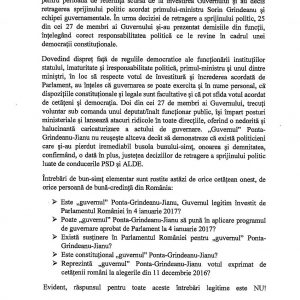 „Dovedind dispreț față de regulile democratice ale funcționării instituțiilor statului, imaturitate și iresponsabilitate politică, primul-ministru și unul dintre miniștri, în loc să respecte votul de investitură și încrederea acordată de Parlament, au înțeles că guvernarea se poate exercita și în nume personal, că dispozițiile constituționale și legale sunt facultative și că pot sfida votul acrodat de cetățeni și democrația. Doi din cei 27 de membri ai Guvernului, trecuți voluntar sub comanda unui deputat/înalt funcționar public, își împart posturi ministeriale și lansează atacuri ridicole în toate direcțiile, oferind o nedorită și halucinantă caricaturizare a actului de guvernare.