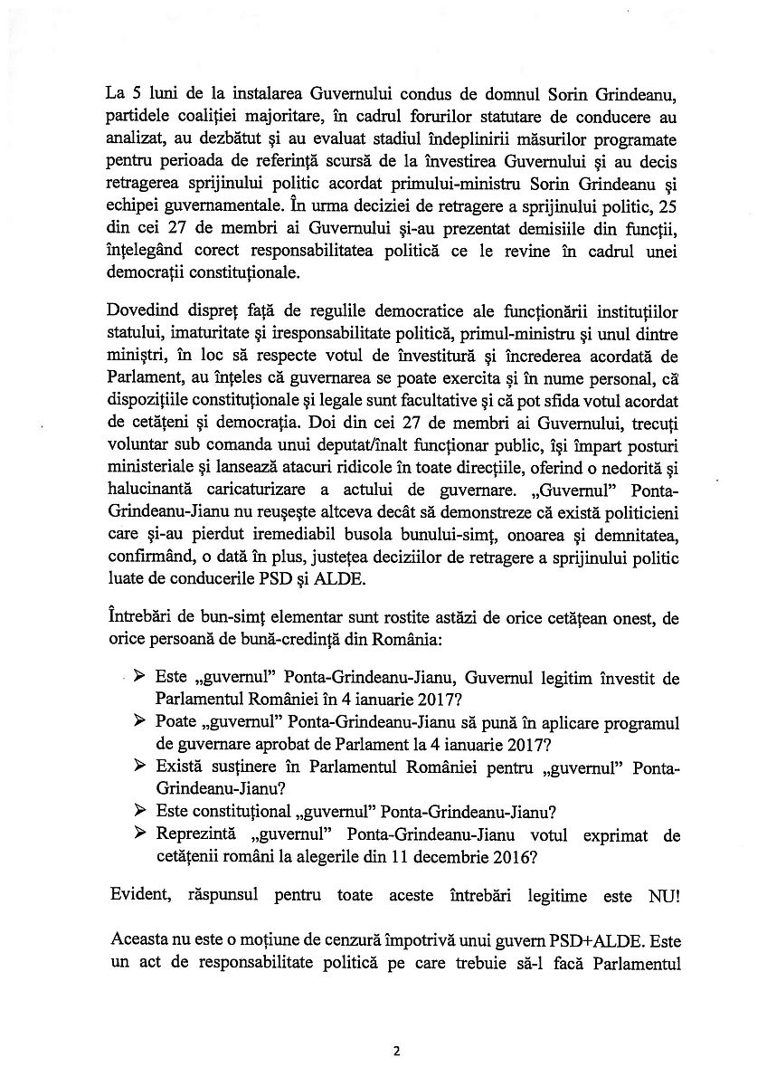 „Guvernul” Ponta-Grindeanu-Jianu nu reușește altceva decât să demonstreze că există politicieni care și-au pierdut iremediabil busola bunului simț, onoare și demnitatea, confirmând, o dată în plus, justețea deciziilor de retragere a sprijinului politic luate de conducerile PSD și ALDE”, mai spune textul moțiunii, care menționează că, în opinia autorilor, guvernul actual nu mai este legitim și nu are cum să îndeplinească programul de guvernare.