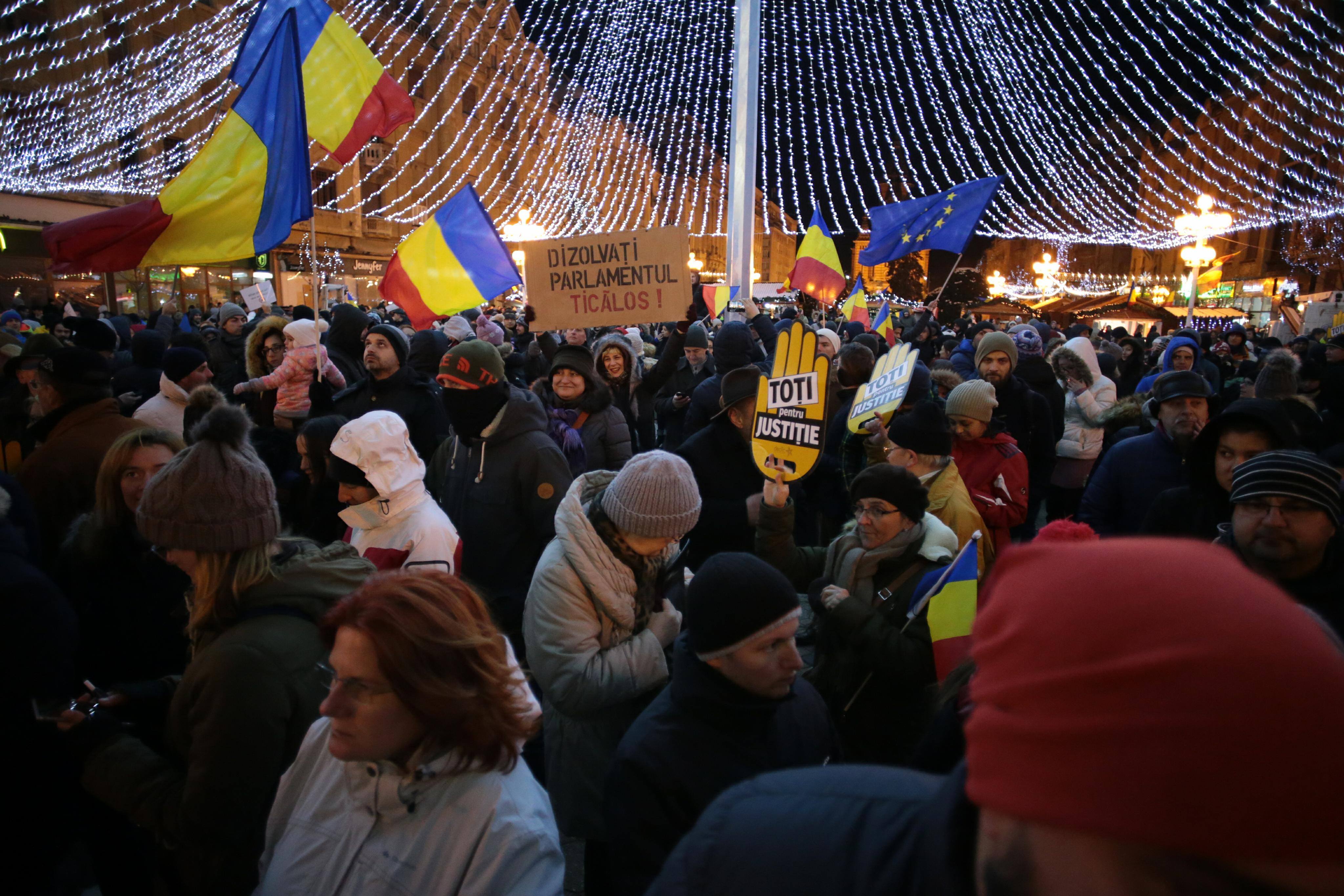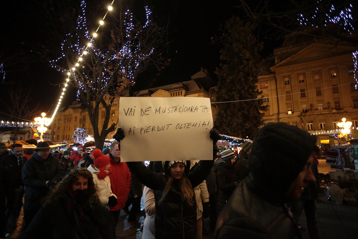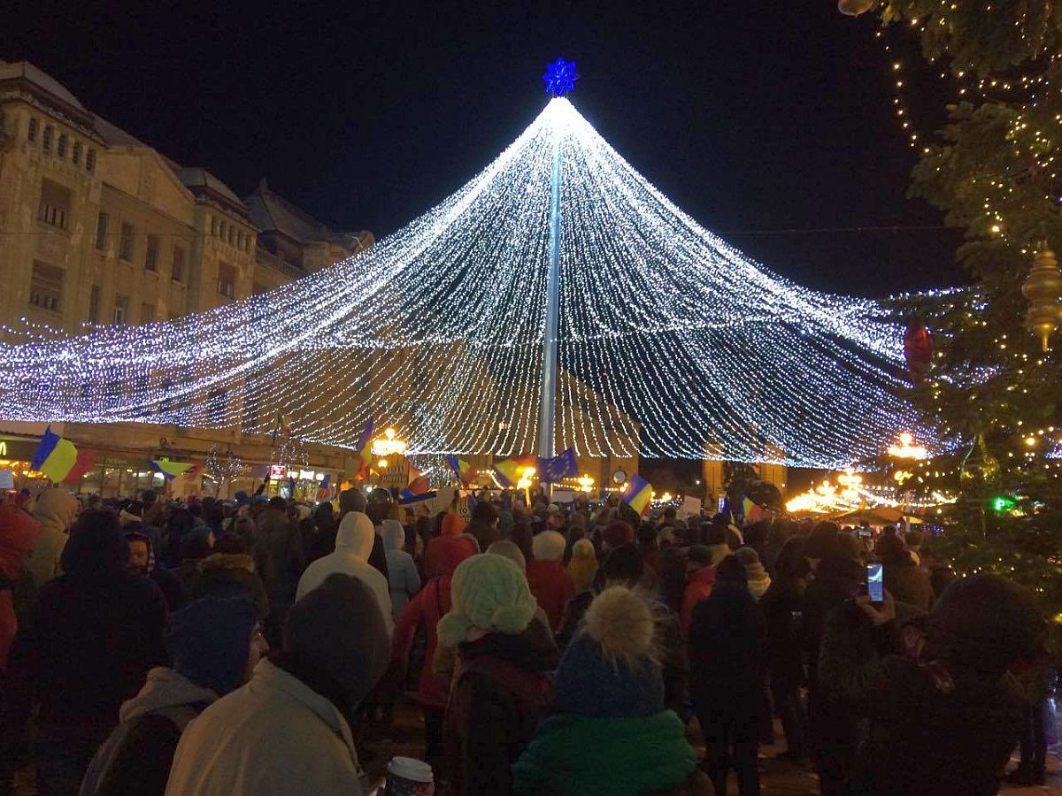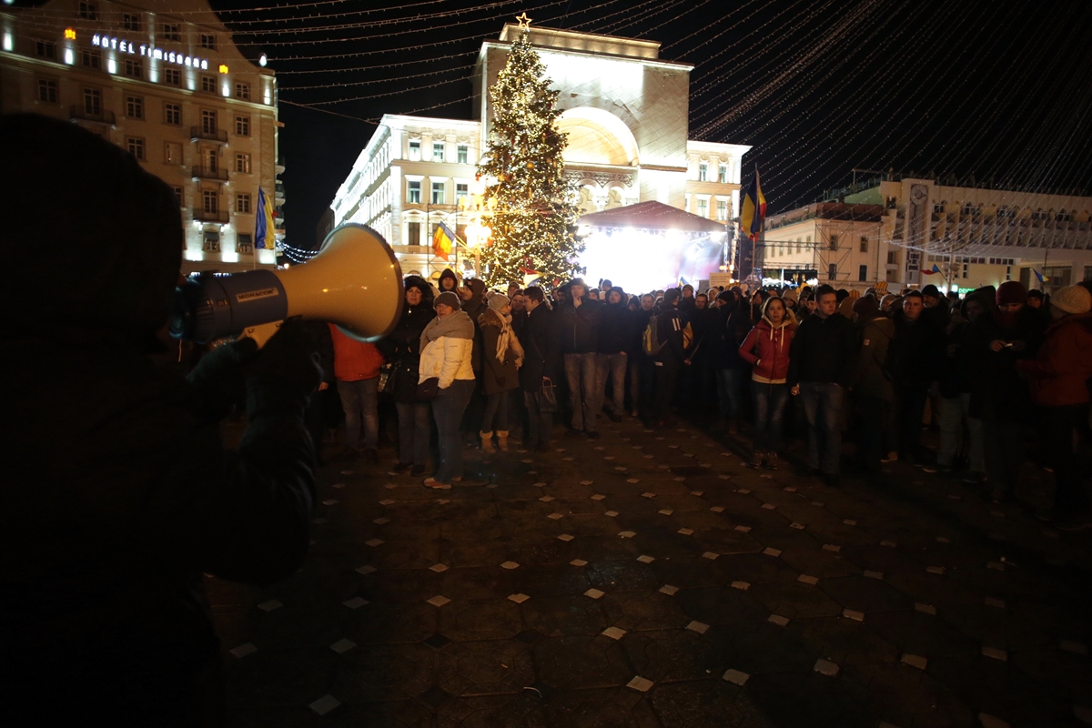 UPDATE Protestul a început, însă numărul este aproape imposibil de estimat, în zonă aflându-se timișoreni care vizitează târgul de Crăciun din centrul orașlui, asistând și la concertul de pe scena din fața Operei. Singurul incident i-a avut ca protagoniști pe jurnaliștii Antena 3 care transmiteau live din piață, aceștia fiind agresați verbal de un timișorean.