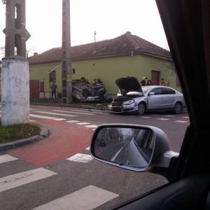 Două mașini s-au izbit puternic una de cealaltă, în această dimineață, în Arad. În urma accidentului, unul dintre autoturisme a ajuns cu roțile în sus, iar partea din față a celuilalt a fost distrusă.