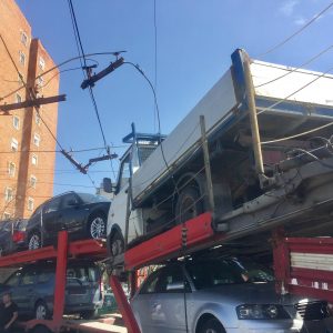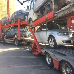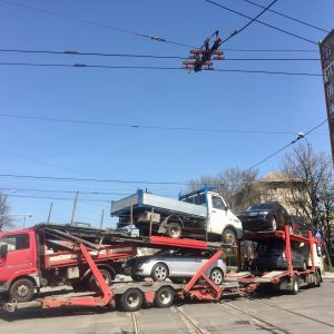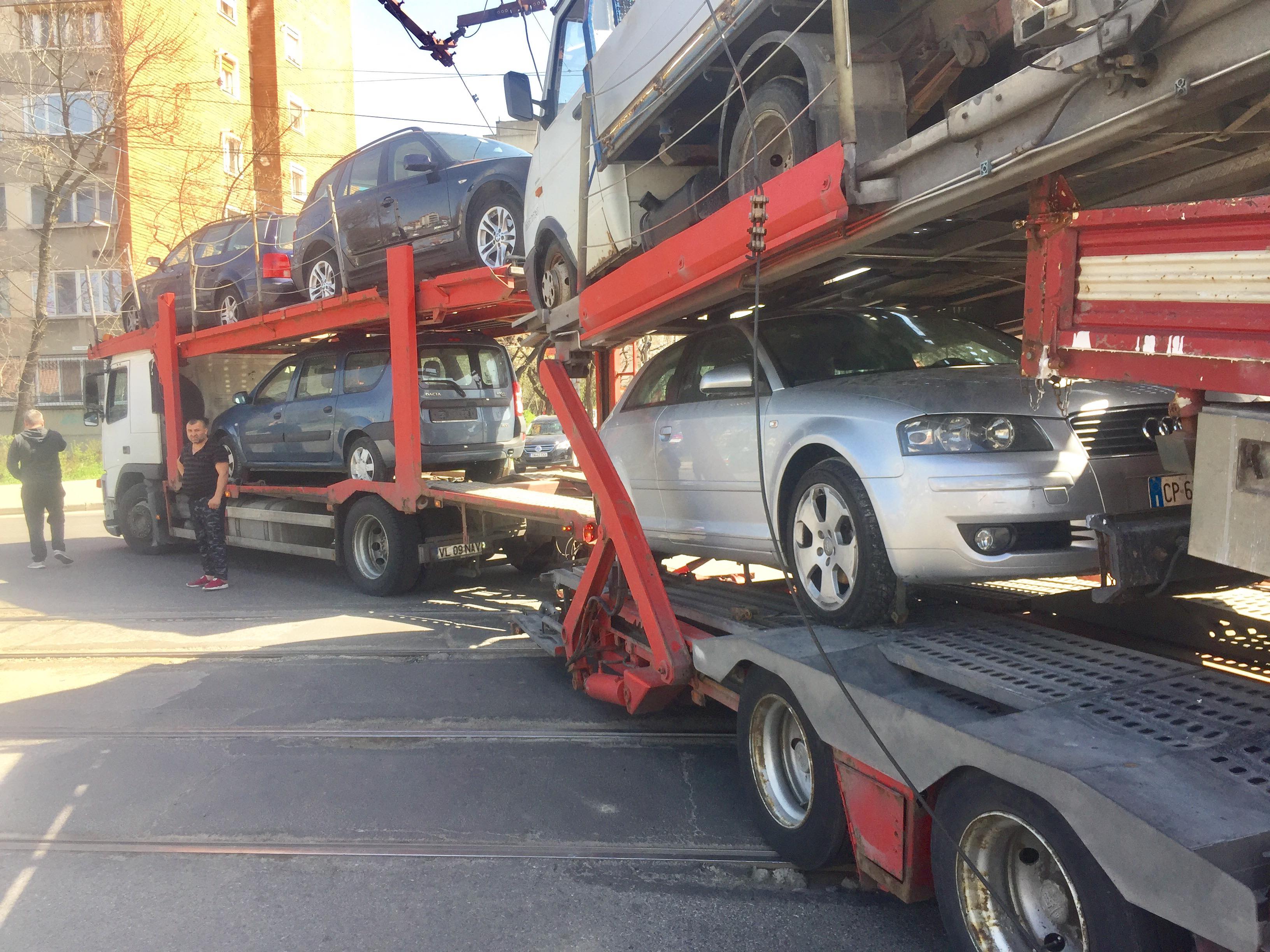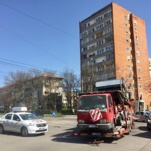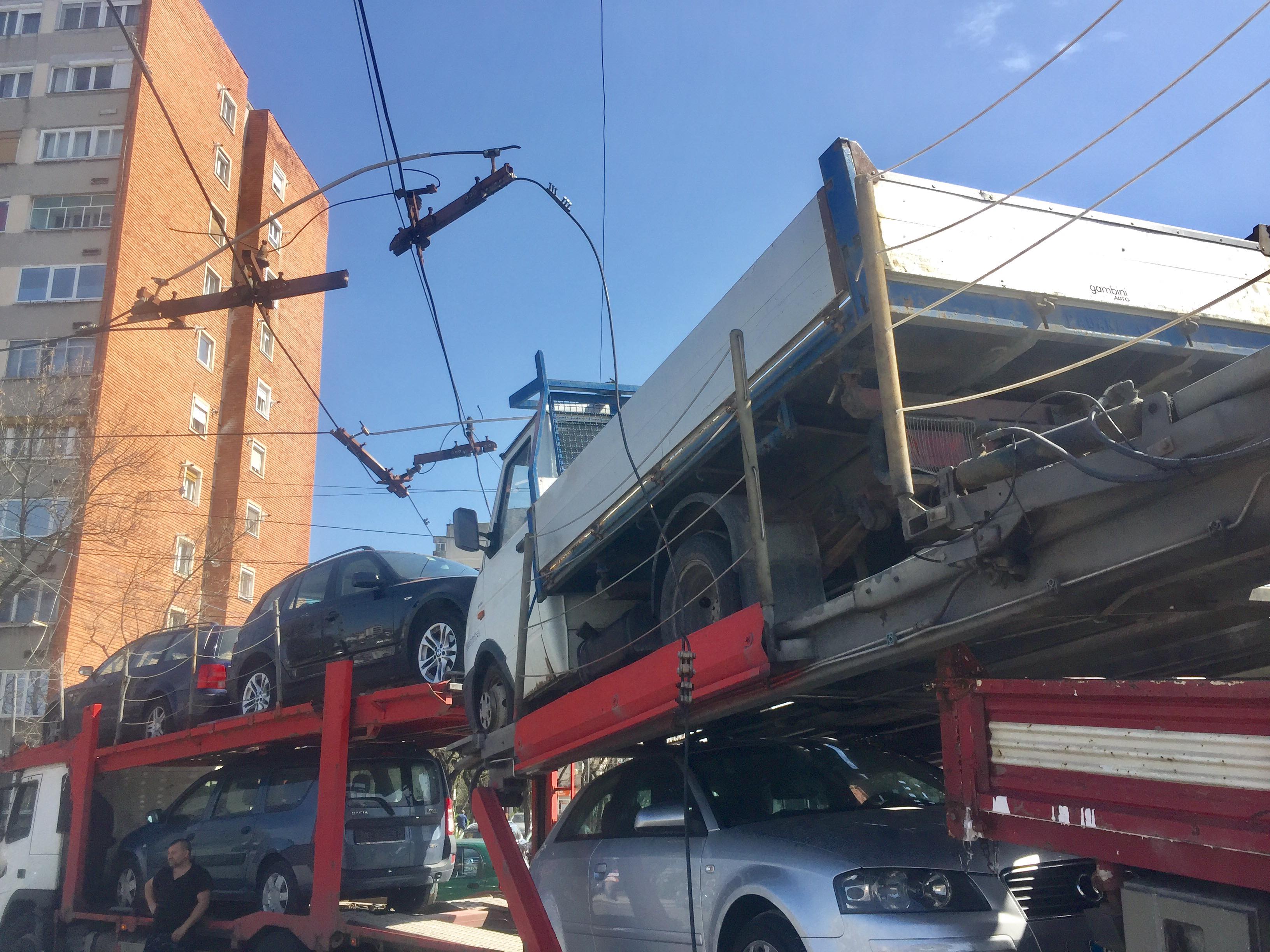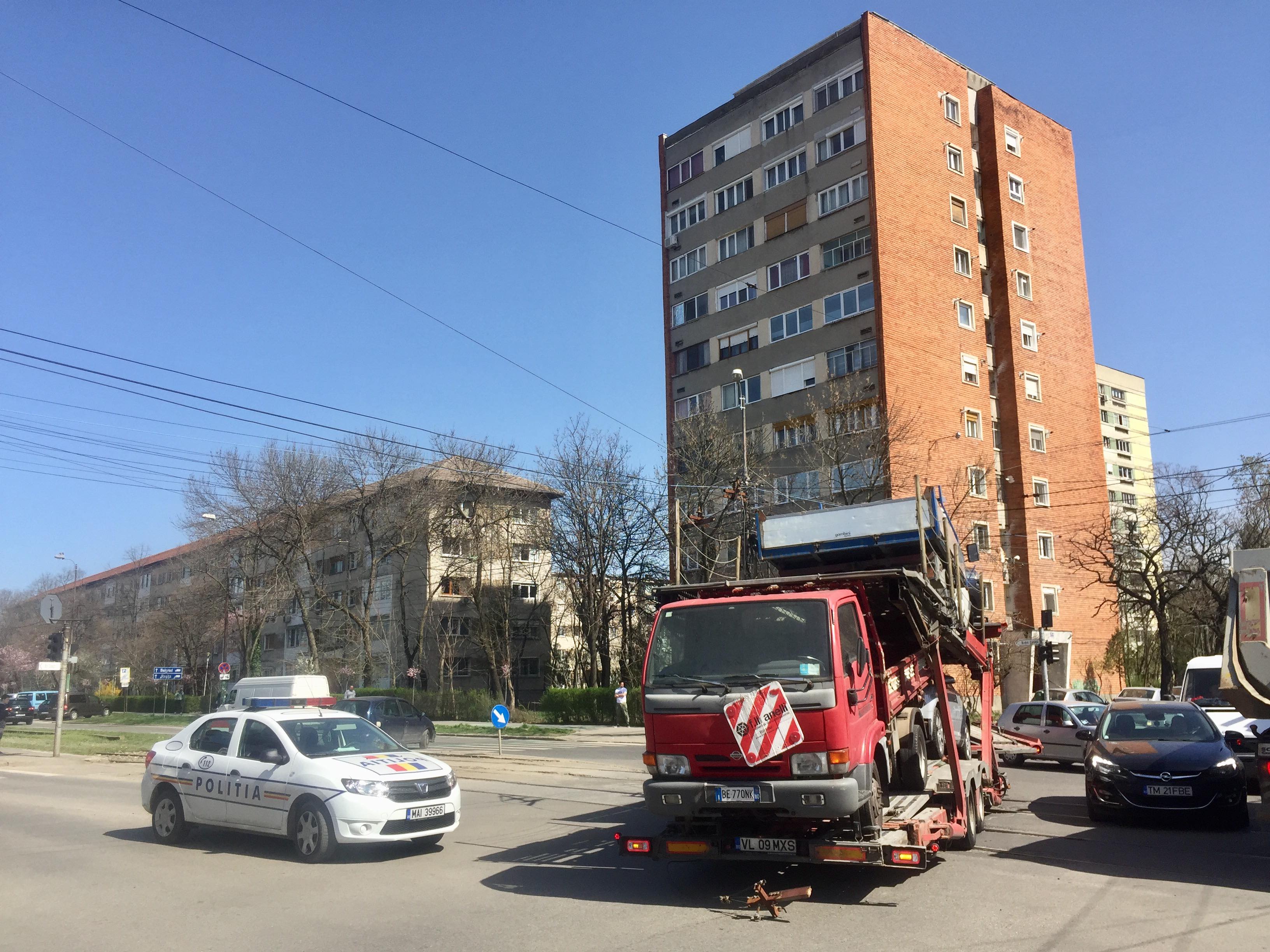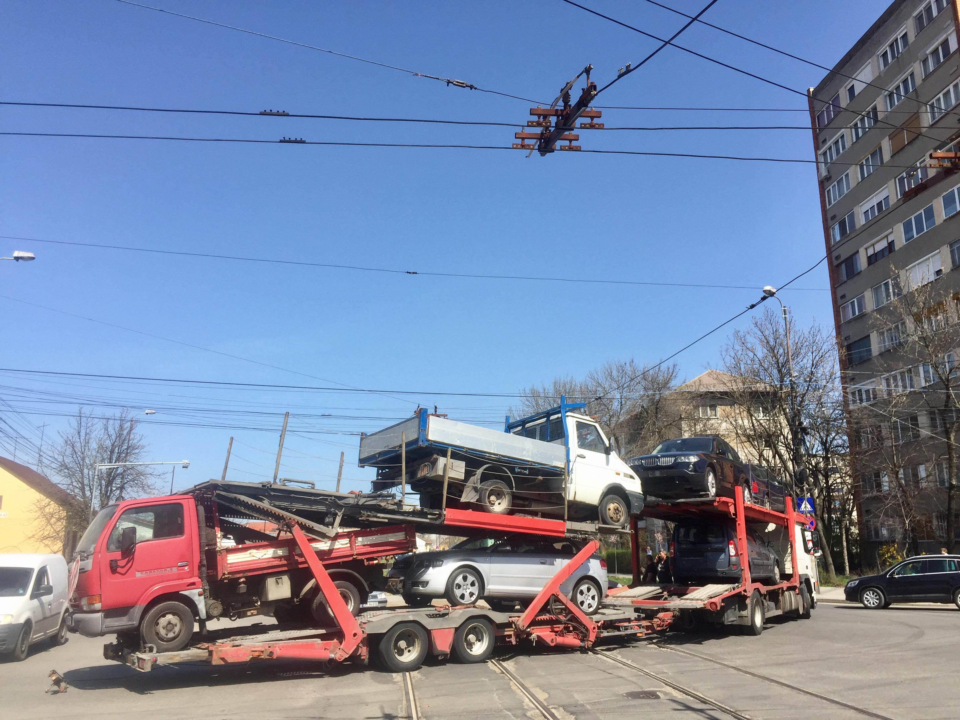 Circulaţie dată peste cap într-o intersecţie din Timişoara. Un TIR care tracta un şlep lung, pe care se aflau mai multe autovehicule, a blocat circulaţia la intersecţia străzilor Cetăţii şi Cloşca, după ce a agăţat liniile de tramvai.