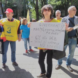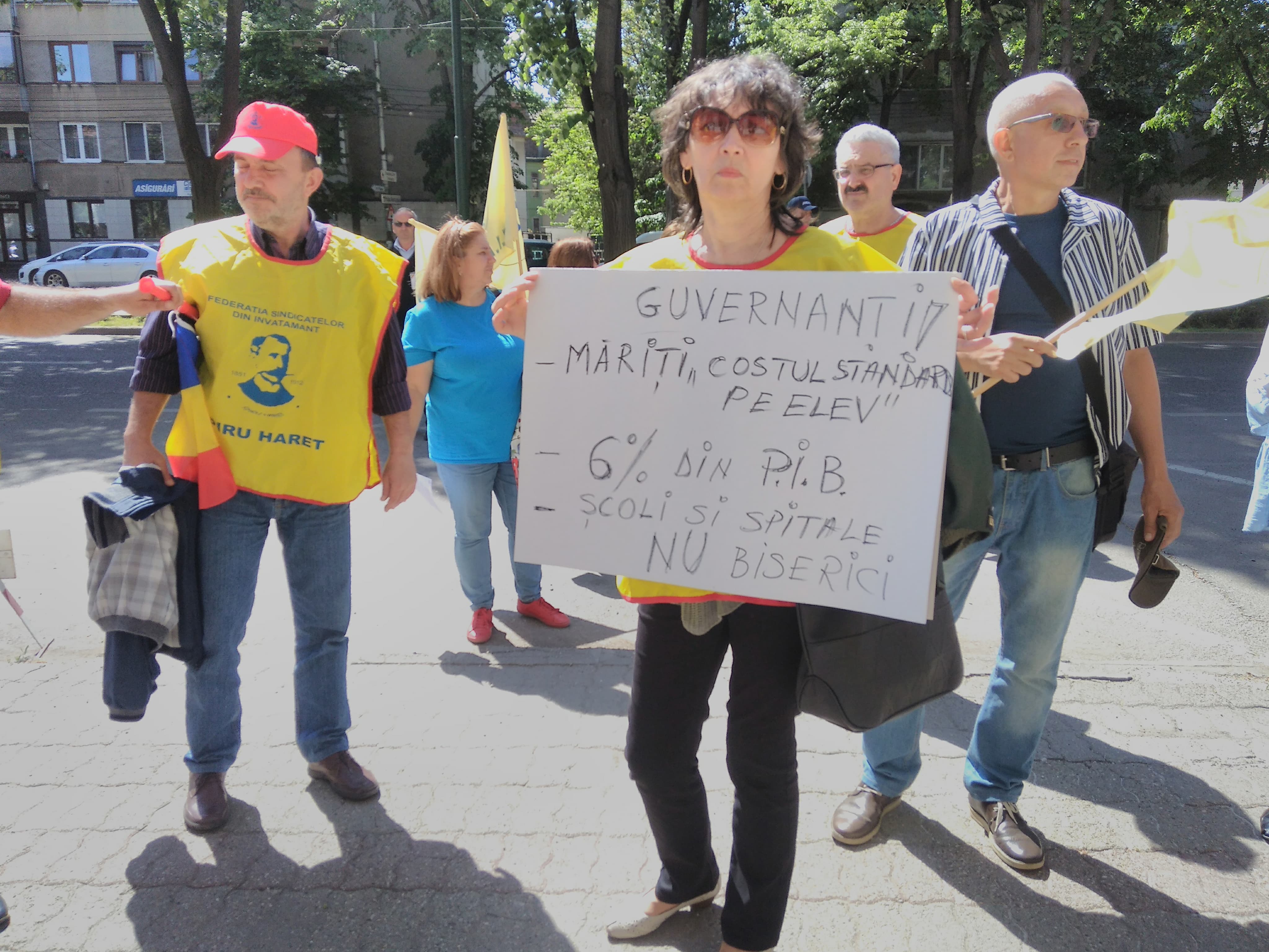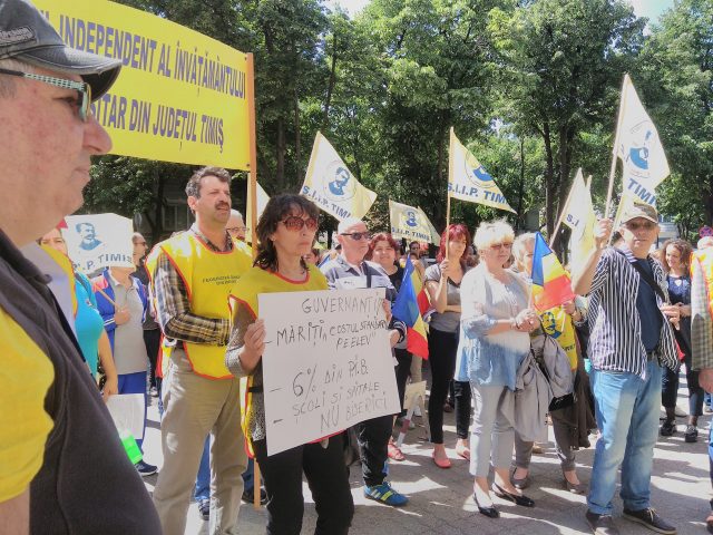 Aproximativ 100 de profesori din județ protestează astăzi în fața Prefecturii Timiș, solicitând creșterea costului per elev, astfel încât să poată fi asigurat fondul de salarii pentru angajații din unitățile de învățământ. Manifestanții țin pancarte cu mesaje precum „Guvernanți, măriți costul standard pe elev. Școli și spitale, nu biserici”, „6% din PIB” sau „PSD, asigura salarii, nu dezbinare și descriminare”. La protest participă profesori care fac parte din Sindicatul Independent al Învățământului preuniversitar din judetul Timis.