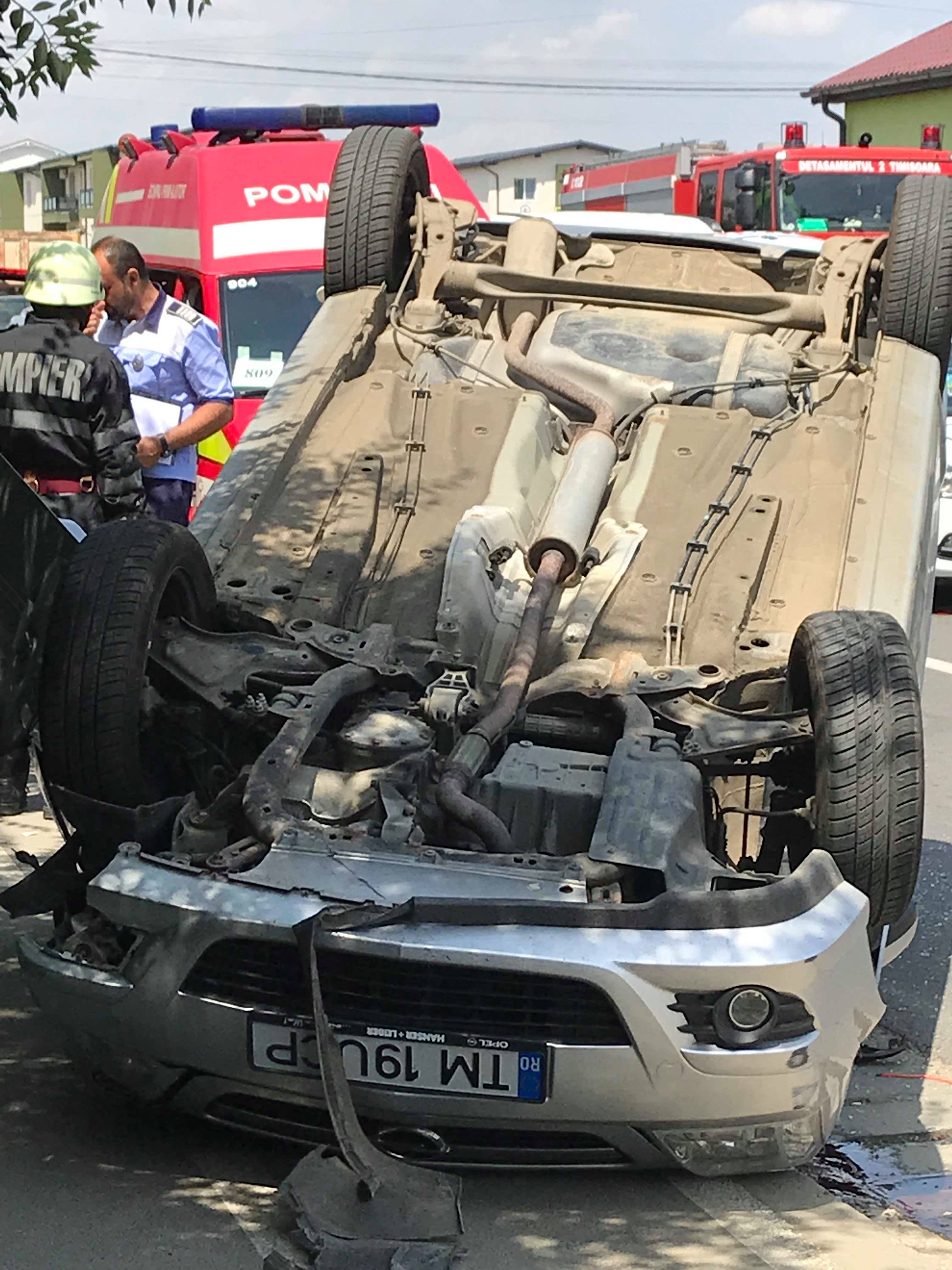 O femeie care conducea un autoturism pe strada Martirilor şi se îndrepta înspre Giroc s-a întors cu roţile în sus. În vârstă de 66 de ani, vârstnica a scăpat fără răni, în ciuda faptului că maşina a fost serios avariată. Cauza accidentului este nerespectarea distanţei regulamentară faţă de maşina care circula în faţa sa, şi care era condusă de un şofer în vârstă de 30 de ani. Ambii conducători auto au fost supuşi alcooltestului, valoarea rezultată fiind negativă.