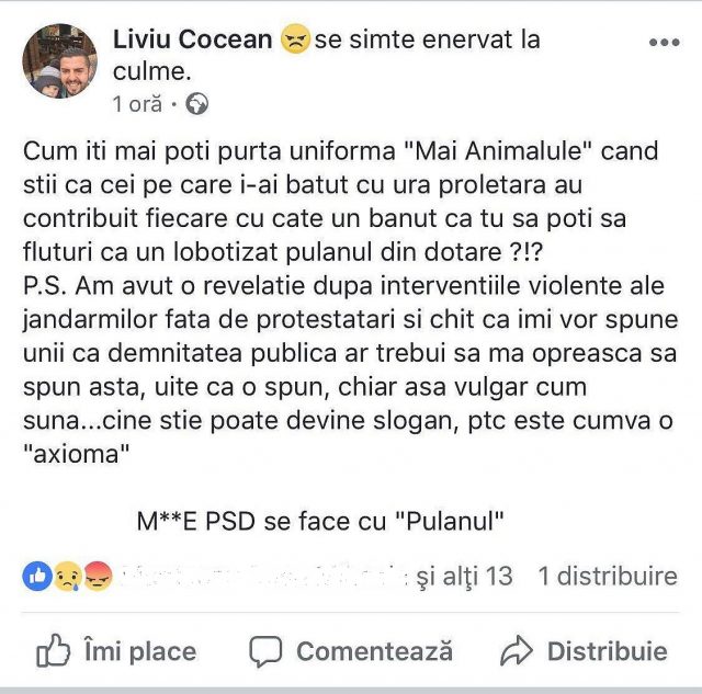 Am avut o revelatie dupa interventiile violente ale jandarmilor fata de protestatari si chit ca imi vor spune unii ca demnitatea publica ar trebui sa ma opreasca sa spun asta, uite ca o spun, chiar asa vulgar cum suna…cine stie poate devine slogan, ptc este cumva o «axioma». M**E PSD se face cu «Pulanul»”, a scris Cocean pe Facebook, ținând să clarifice ultima parte într-un răspuns la un comentariu: „Varianta elegantă, cu topica răsturnată: Pulanul generează M**E PSD…merge?”.