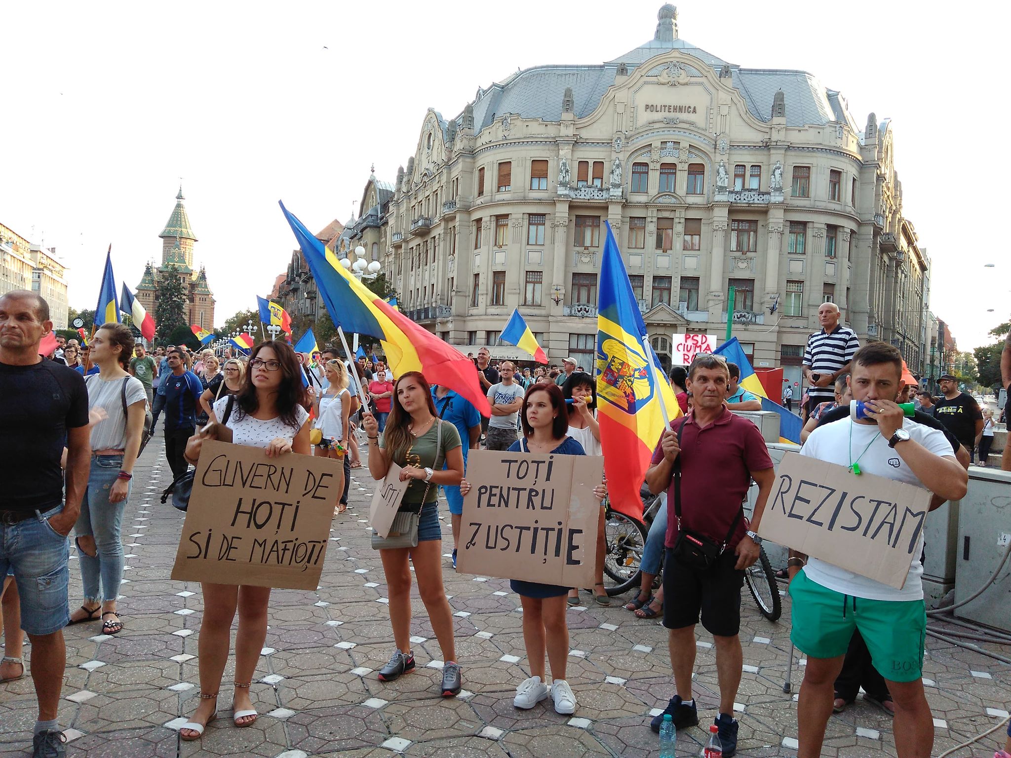 Manifestanții au venit în centrul Timișoarei cu steaguri tricolore și se folosesc de vuvuzele pentru a face zgomot. De asemenea, protestarii țin în mâini pancarte cu mesaje precum „Tăt ni-s freș”, „PSD, ciuma roșie”, „Toți pentru justiție”, „Rezistăm” sau „Guvern de hoți și de mafioți”, și scandează lozinci ca „Afară cu hoții din țară”, „Până la capăt”, „Ieșiți din casă, dacă vă pasă”, „Hoții”, „M..e PSD” sau „Demisia”.
