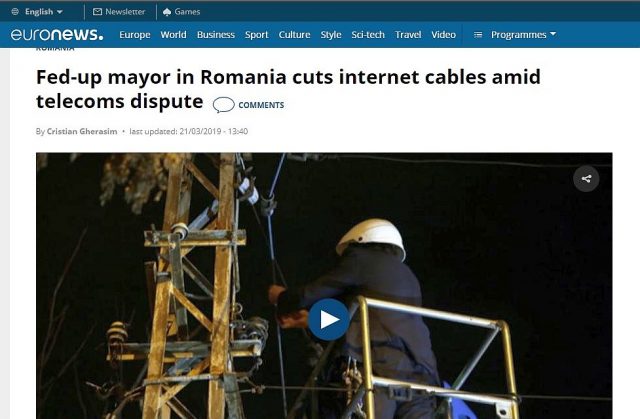 Euronews a relatat astăzi povestea „primarului sătul de ignorarea obligației de a muta cablurile în subteran”, folosind inclusiv imagini PRESSALERT.ro. Cunoscuta instituție media amintește de Inspectoratul Școlar și alte instituții lăsate fără comunicații, menționând și că edilul-șef ar putea avea probleme cu Protecția Consumatorului în urma isprăvii sale.
