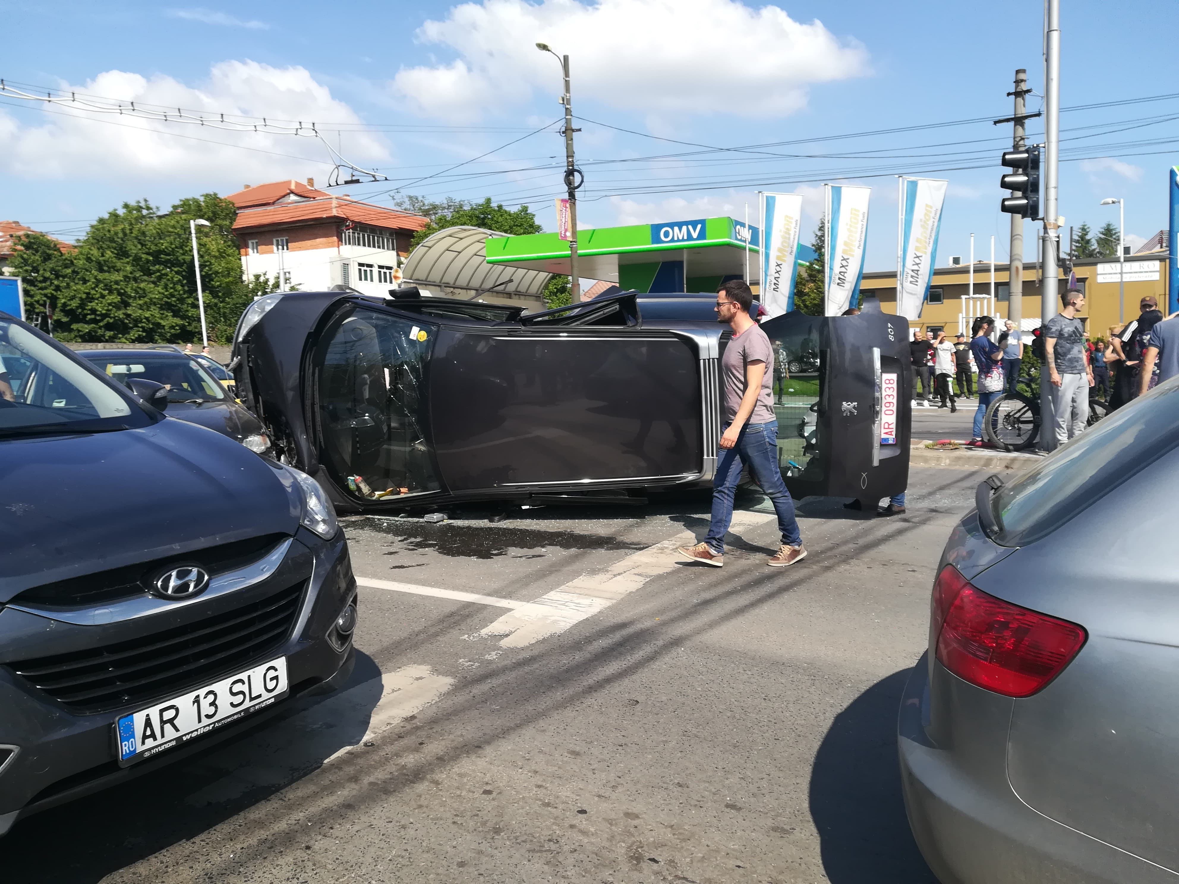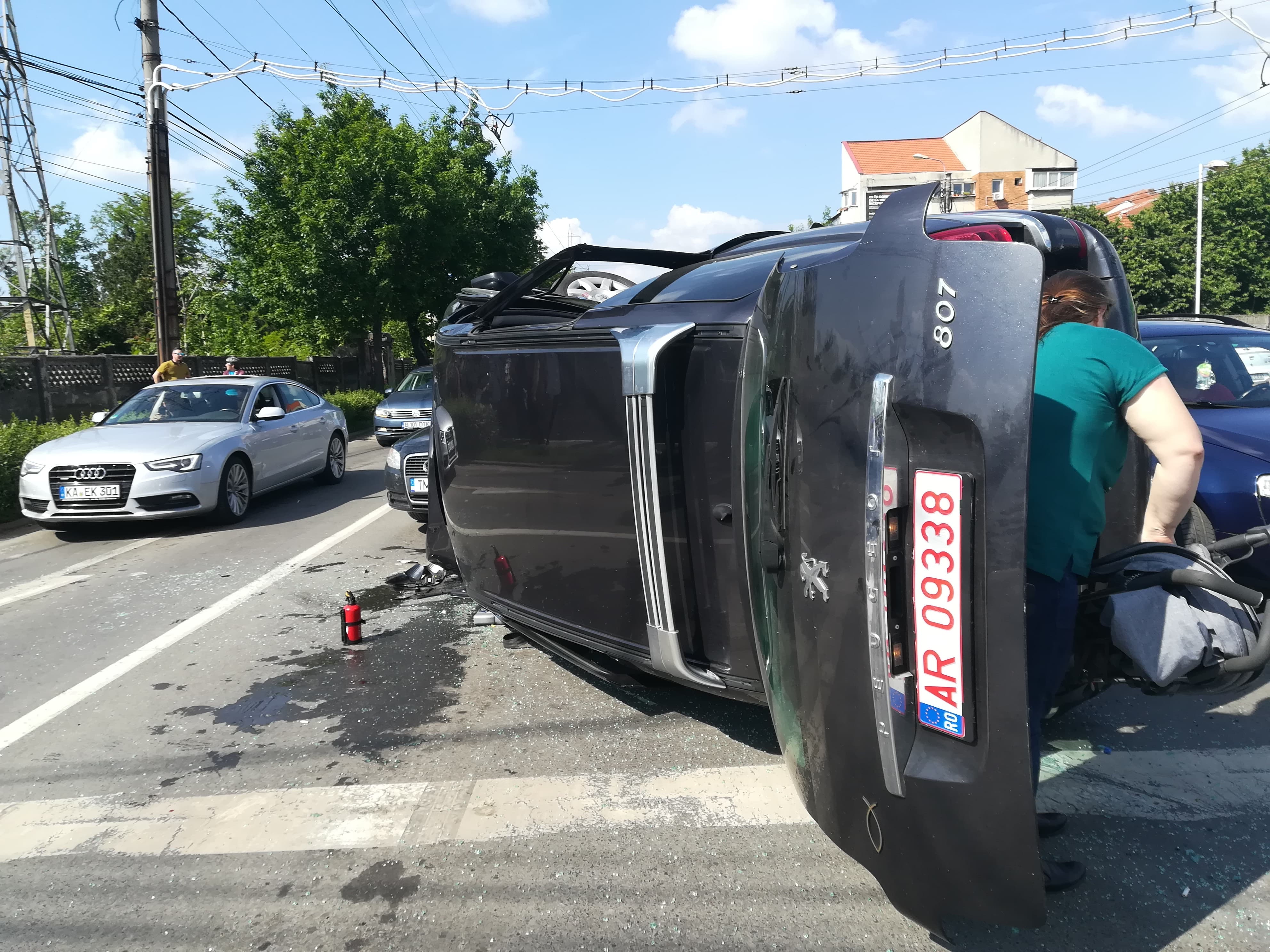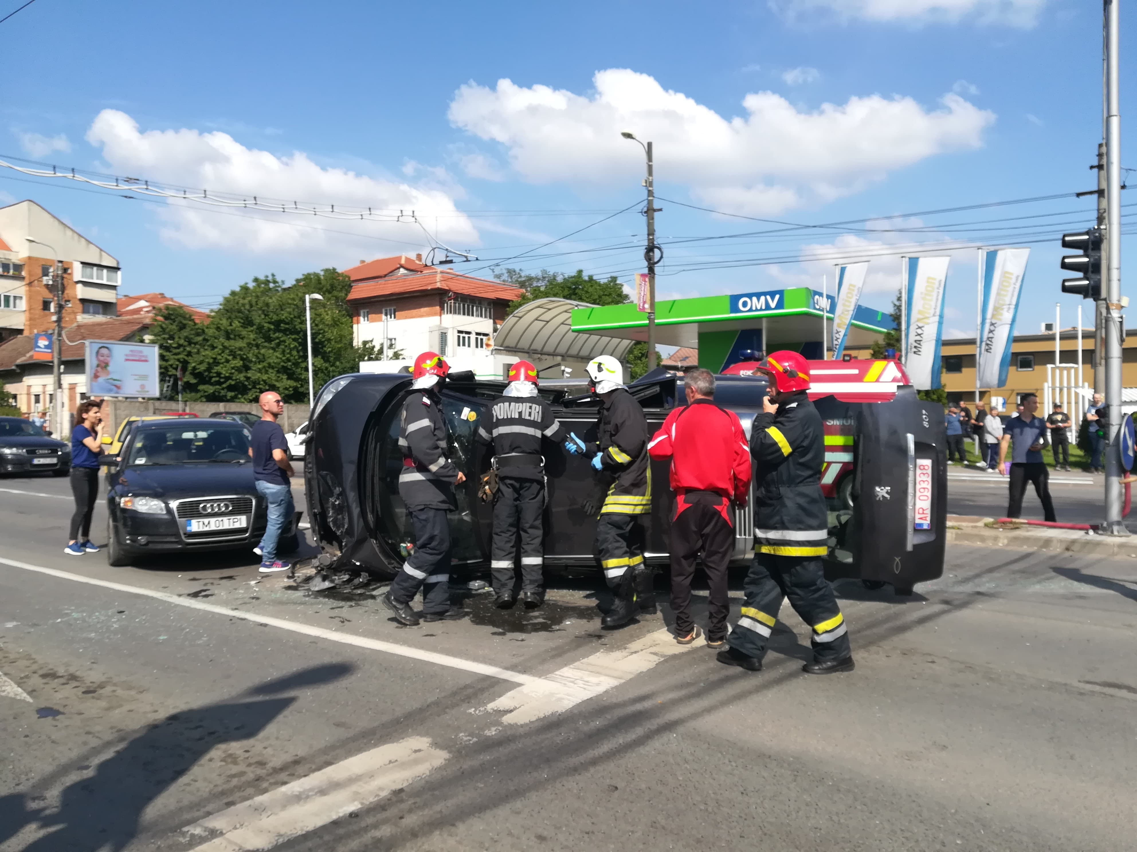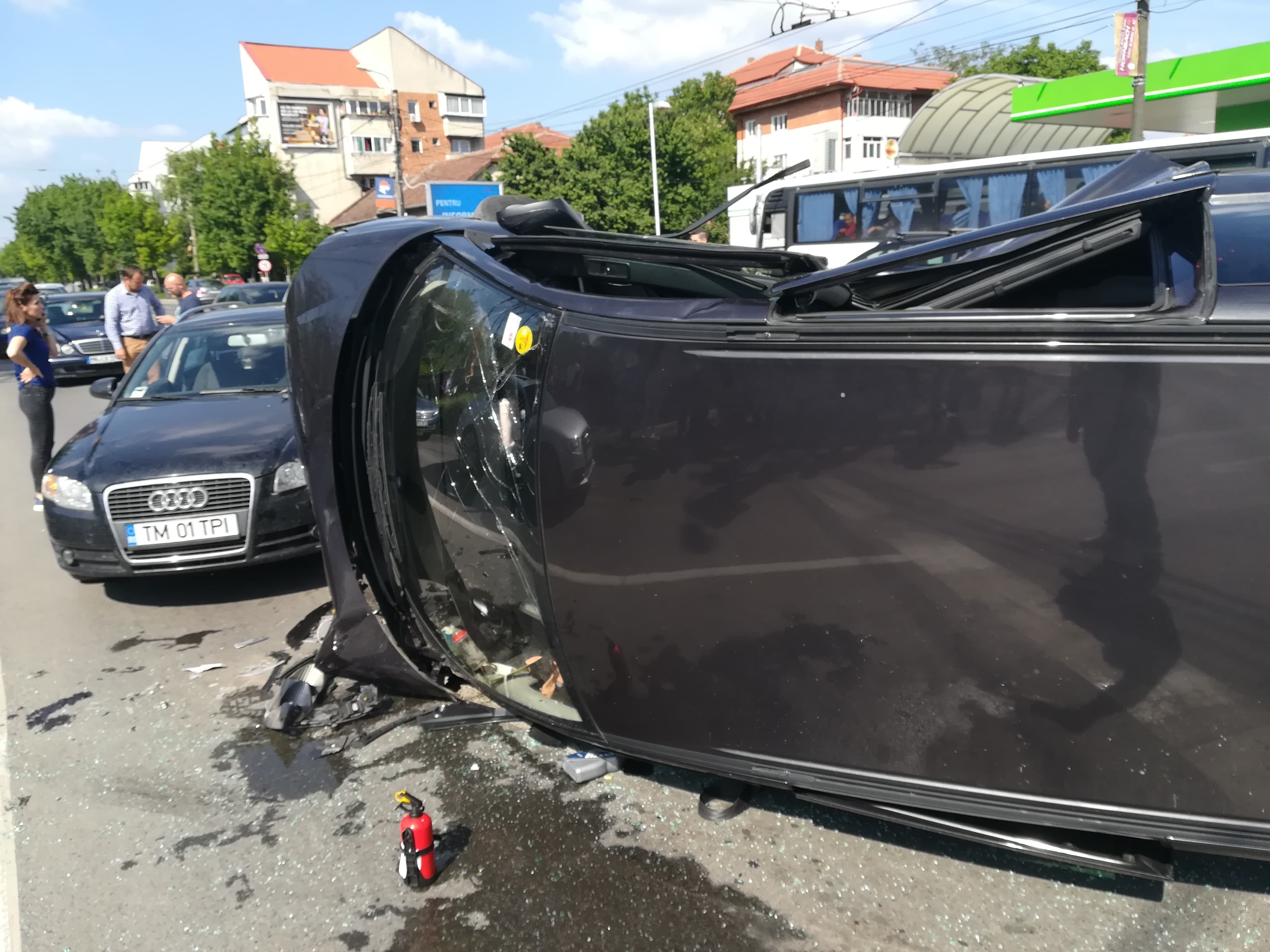 UPDATE 2 După ce au văzut imaginile de pe camerele de supraveghere, polițiștii au stabilit că vinovat de producerea accidentului este șoferul Peugeout-ului, în vârstă de 33 ani, care venind dinspre Iulius Mall a intrat în intersecție pe culoarea roșie a semaforului, deși în mașină erau trei copii. A fost lovit din lateral de Logan-ul care venea dinspre strada Demetriade. Peugeot-ul a avariat alte două mașini care așteptau la stop. Doi dintre copiii din mașina răsturnată, în vârstă de 5 și 7 ani, au fost răniți, deși inițial se știa doar de un minor rănit.