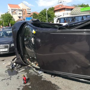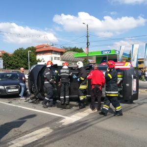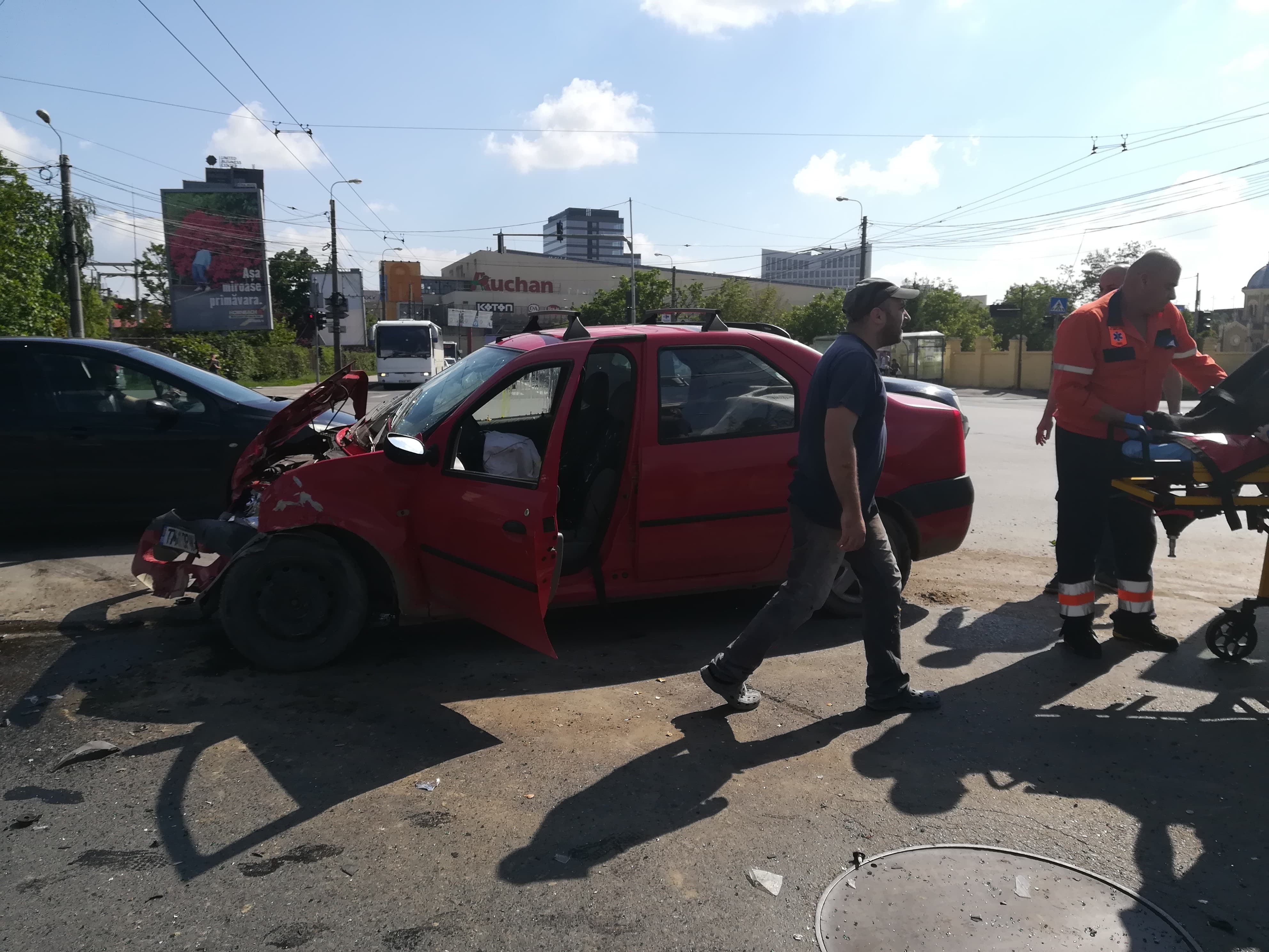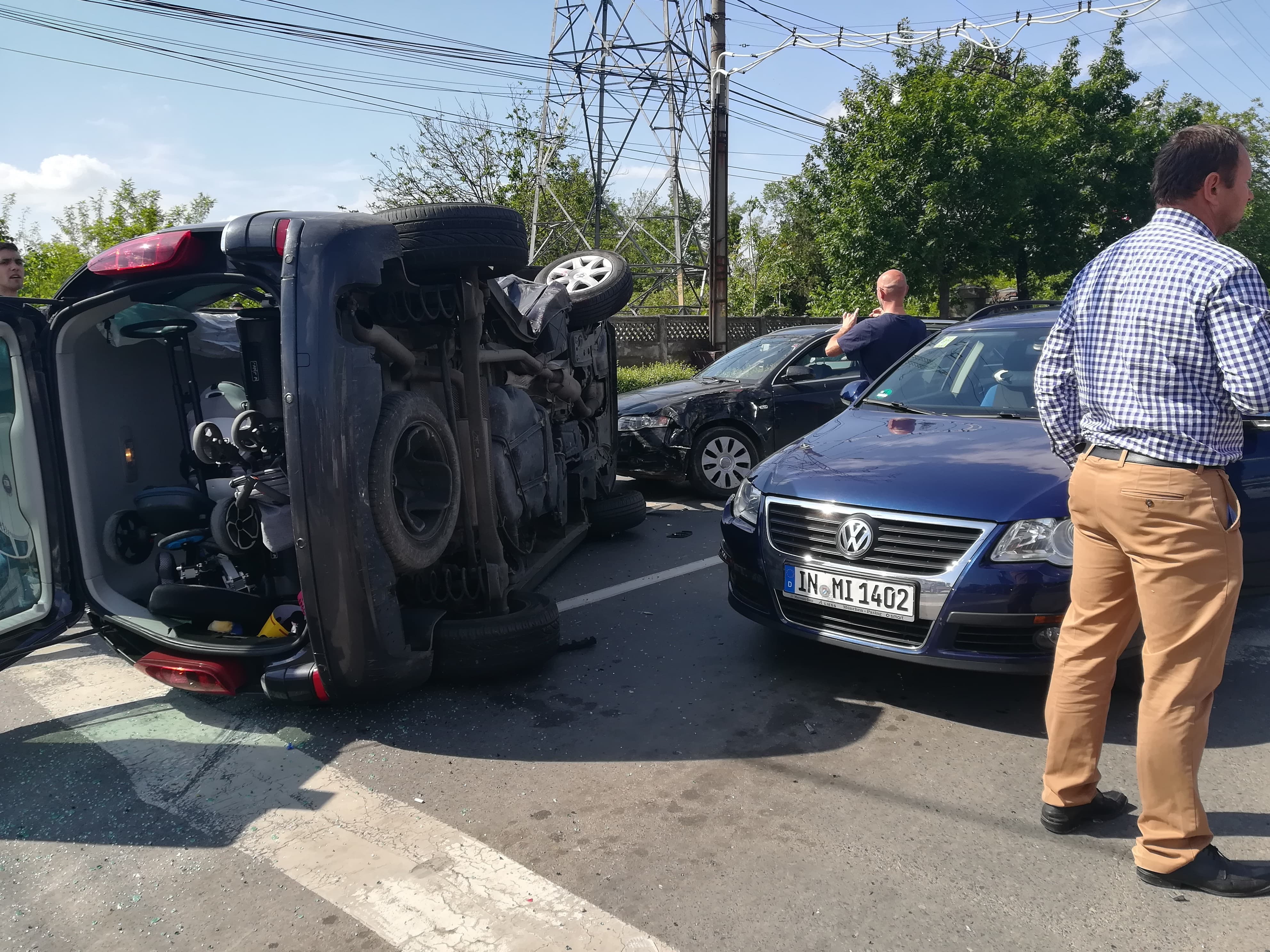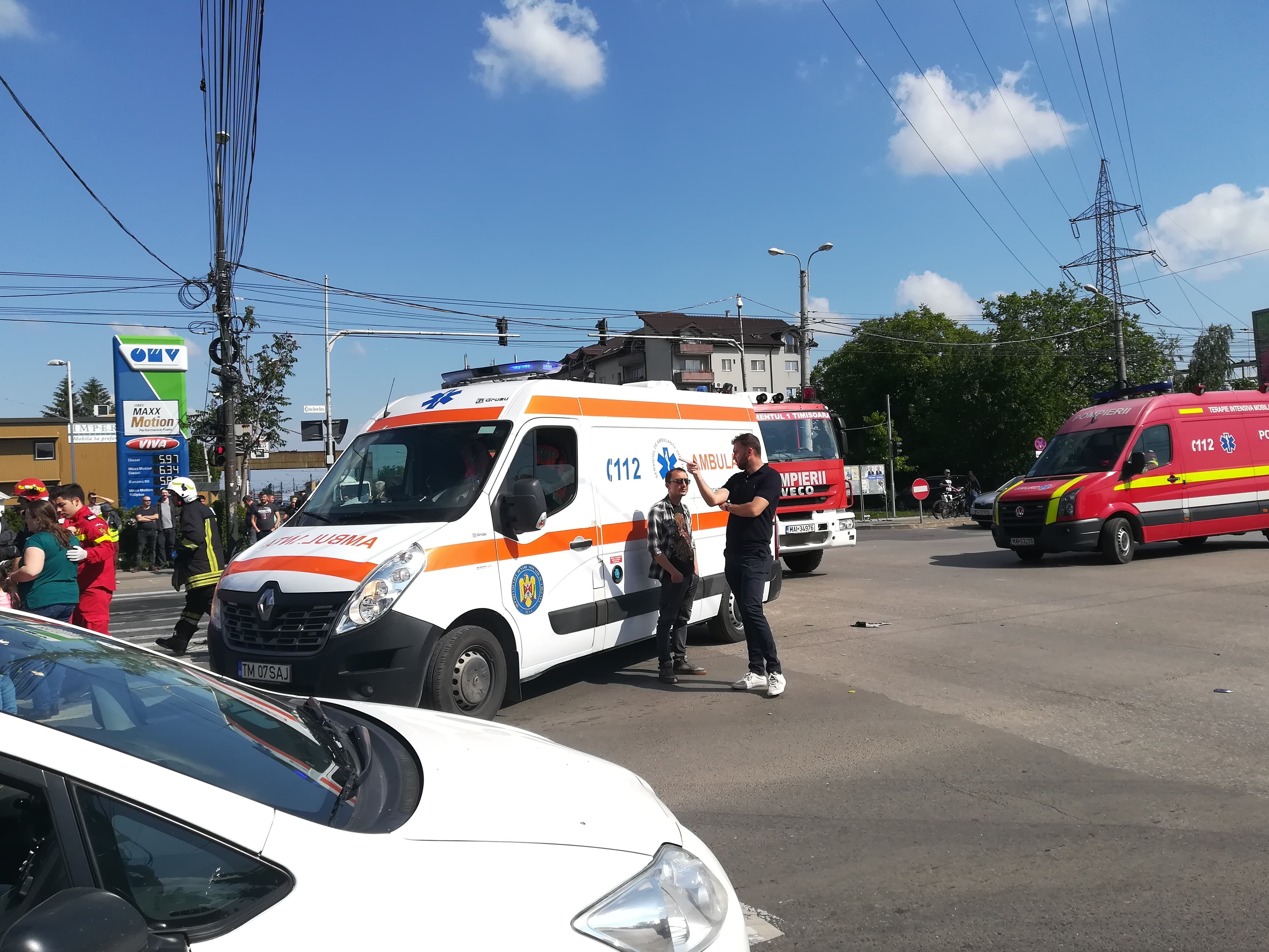 UPDATE 2 După ce au văzut imaginile de pe camerele de supraveghere, polițiștii au stabilit că vinovat de producerea accidentului este șoferul Peugeout-ului, în vârstă de 33 ani, care venind dinspre Iulius Mall a intrat în intersecție pe culoarea roșie a semaforului, deși în mașină erau trei copii. A fost lovit din lateral de Logan-ul care venea dinspre strada Demetriade. Peugeot-ul a avariat alte două mașini care așteptau la stop. Doi dintre copiii din mașina răsturnată, în vârstă de 5 și 7 ani, au fost răniți, deși inițial se știa doar de un minor rănit.