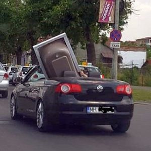 Un șofer a fost surprins pe un bulevard din Timișoara în timp ce transporta cu mașina decapotabilă o vană, imaginile postate pe Facebook stârnind amuzamentul internauților.