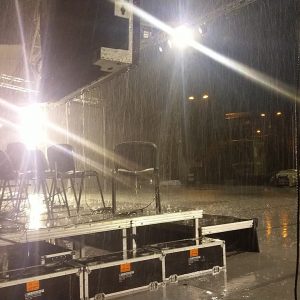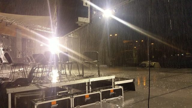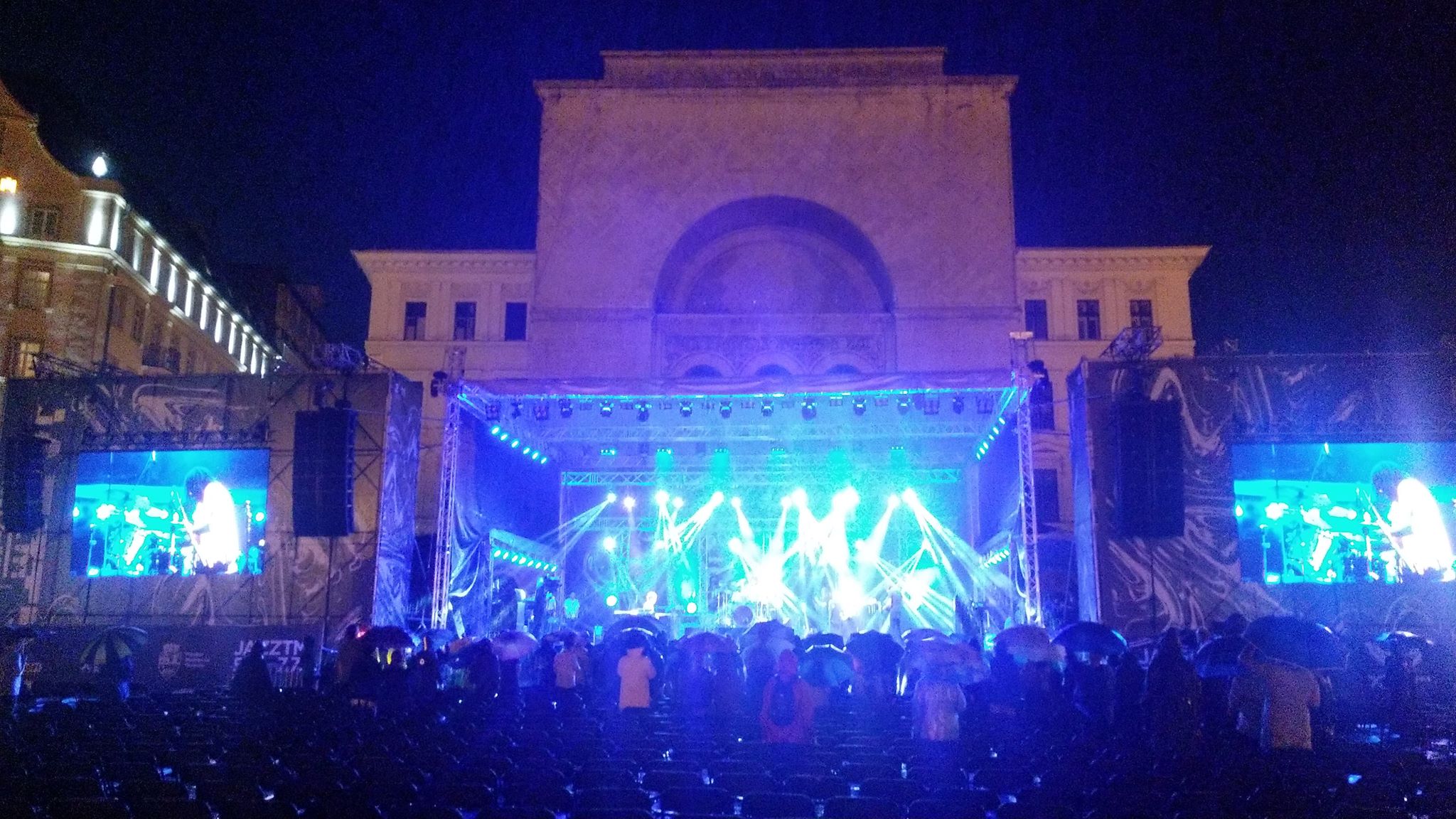 UPDATE 1 Câteva zeci de spectatori de la Jazz Tm au înfruntat furtuna și sunt în continuare în Piața Victoriei, unde muzicienii au reînceput să cânte în ciuda ploii torențiale.