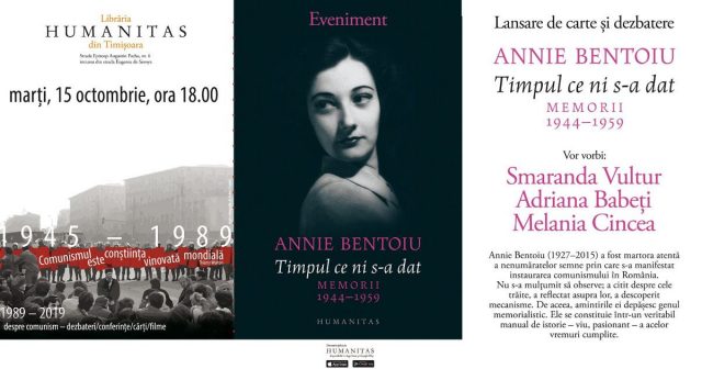 La întâlnirea cu Smaranda Vultur, Adriana Babeţi şi Melania Cincea care va avea loc marţi, 15 octombrie, va fi dezbătut volumul „Timpul ce ni s-a dat. Memorii 1944-1959” de Annie Bentoiu, un adevărat manual de istorie al acelor ani atât de cumpliţi pentru România. Annie Bentoiu (1927-2015) a fost martorul numeroaselor semne prin care s-a manifestat instaurarea comunismului în România şi, ca observator atent, a descoperit şi a înţeles mecanismele care au dus la denaturarea relaţiilor dintre oameni, la frică şi la degradarea demnităţii personale.