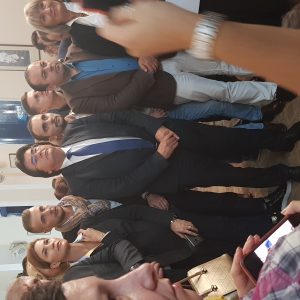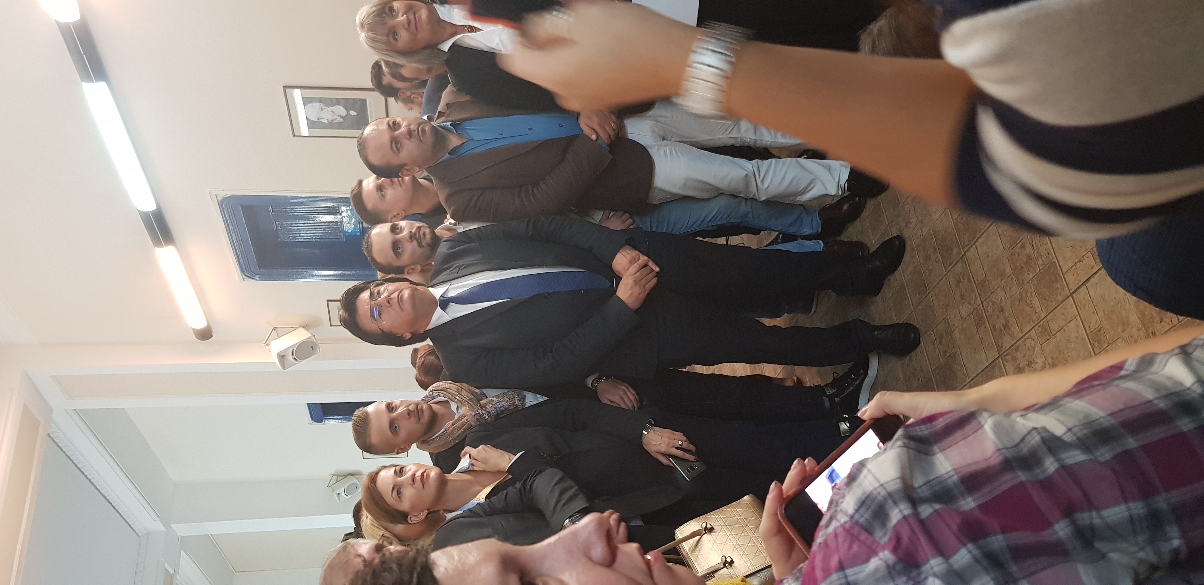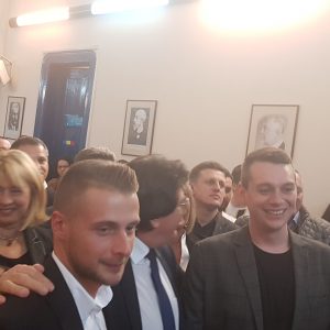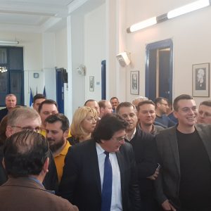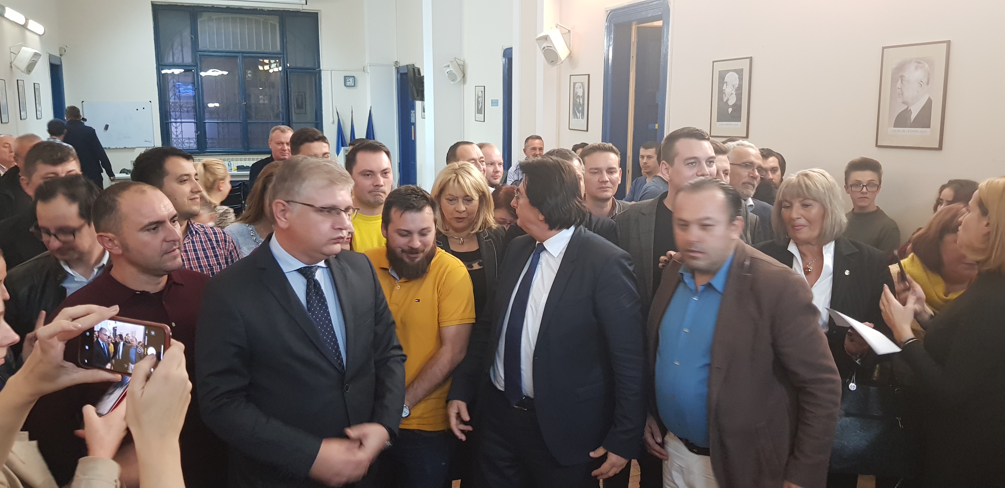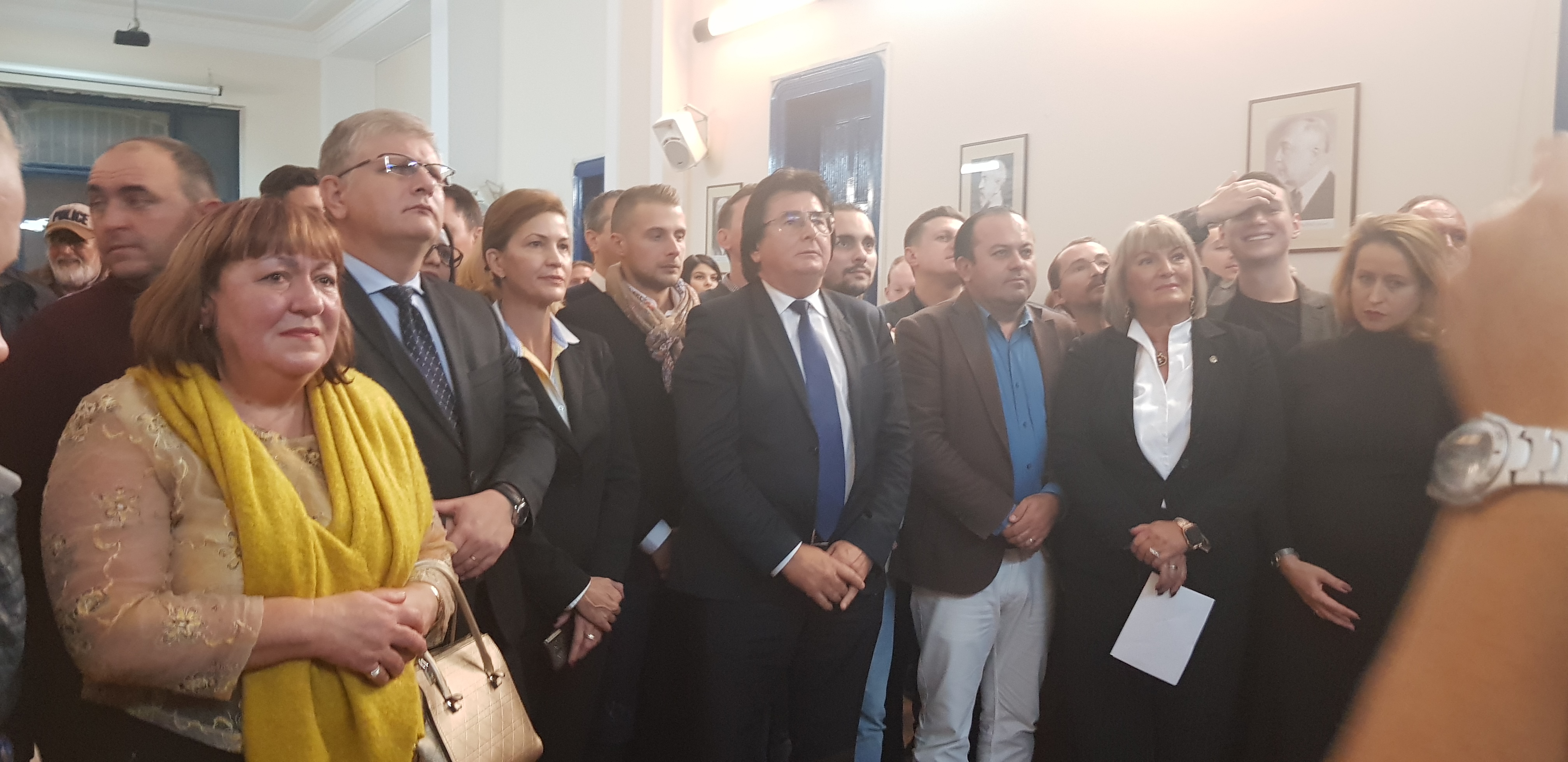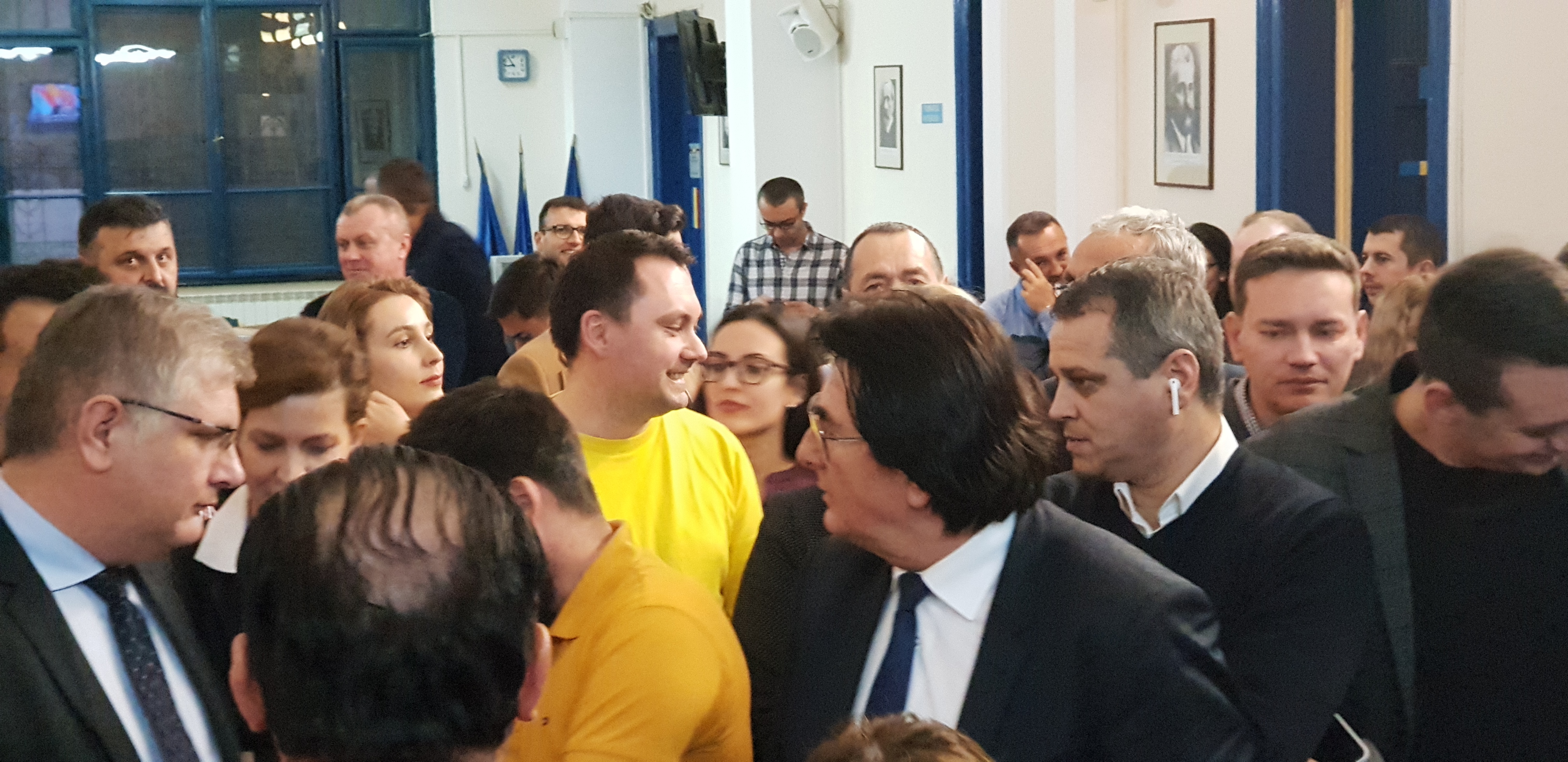 Imediat, în jurul mesei se adună mai mulți membri ai partidului, care se așează în picioare pentru a urmări ce se anunță la televizor. În mijloc se află Cristian Moș, Dan Reșitnec, senatorul Nicu Fălcoi și Dominic Samuel Fritz. „Mai sunt șase minute. Dați mai tare, că nu auzim”, spune o femeie, iar imediat sonorul este dat aproape la maxim.