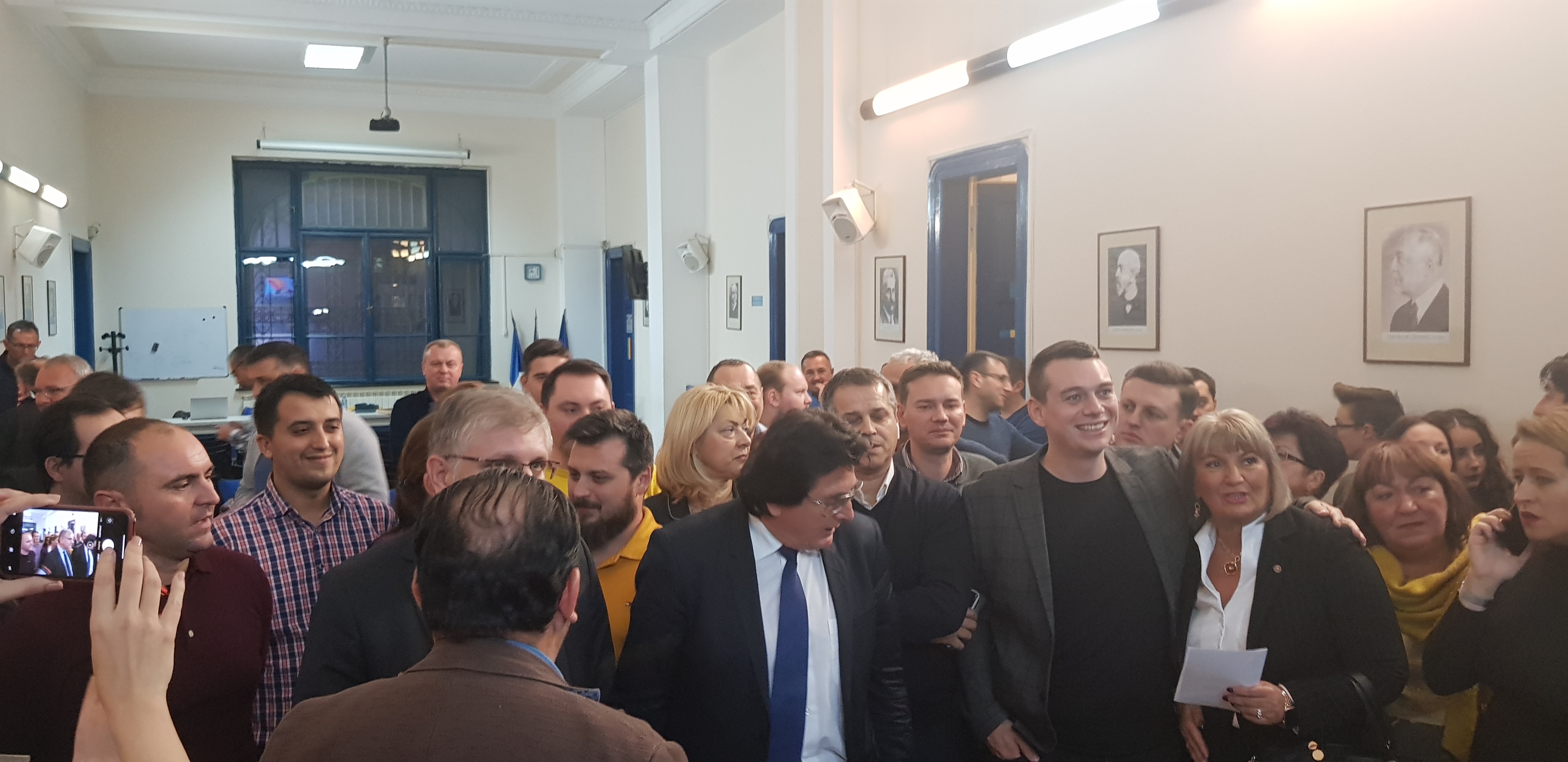 Ora 21.00. Tăcere în momentul în care pe un post apar rezultatele exit-poll, preț de câteva secunde. O membră a partidului începe să plângă, iar lui Cristian Moș i se înroșesc ochii. Toți privesc înmărmuriți cifrele de la televizor. „Nu cred, nu e ăsta rezultatul”, se aude vocea lui Nicu Fălcoi. Imediat, se mută canalul. „E și mai rău aici”, spune unul din cei prezenți în sală. „O să fie o noapte lungă. Hai, băieți, la treabă”, se aude un alt membru USR Timiș.