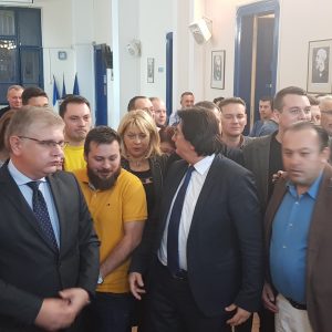 „Vă rog, vreau un pupitru de carton și un afiș cu alianța USR-PLUS”, se aude vocea lui Cristian Moș, președintele USR Timiș, care își face prezența în cameră. Între timp, Dan Reșitnec, liderul USR Timișoara, se plimbă dintr-o parte într-alta, discutând cu cei prezenți.