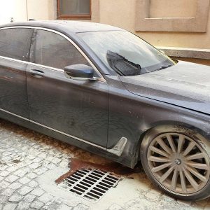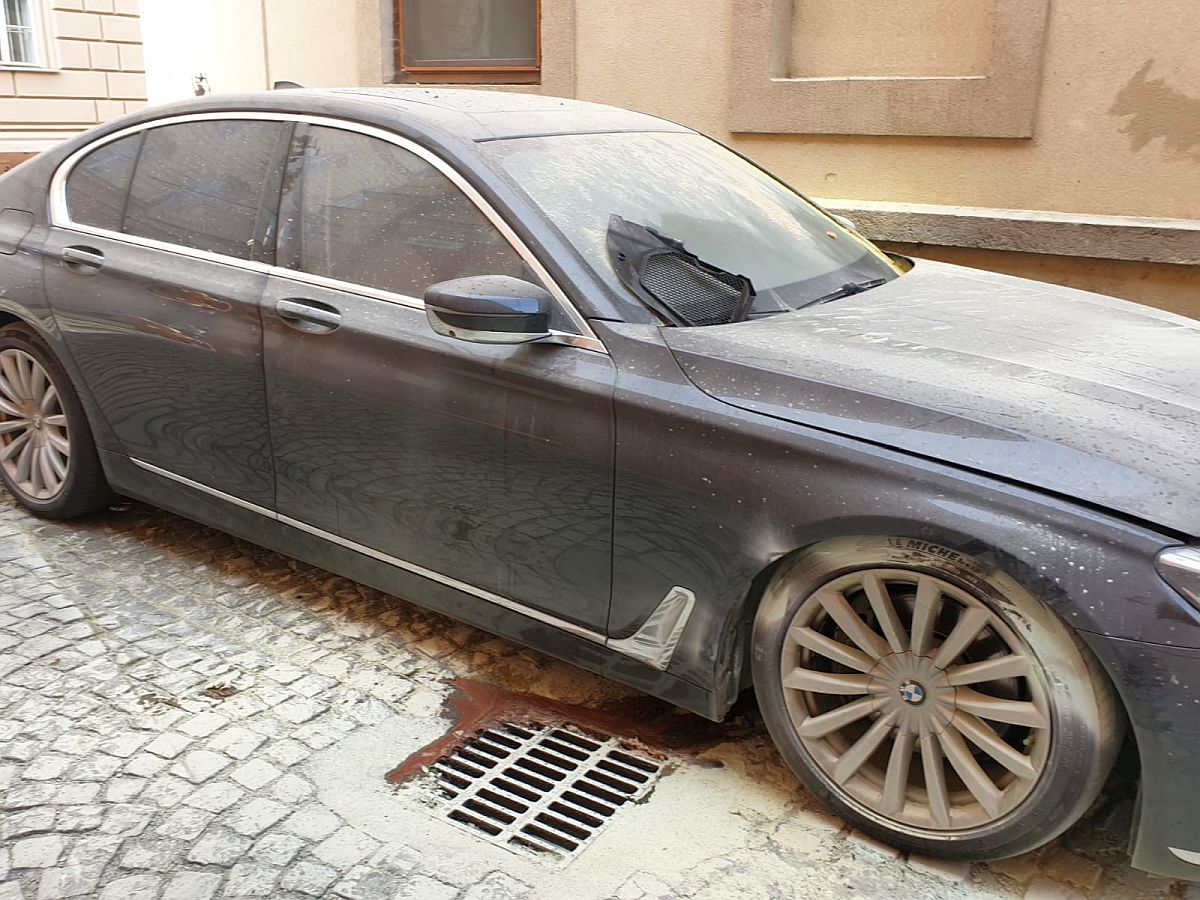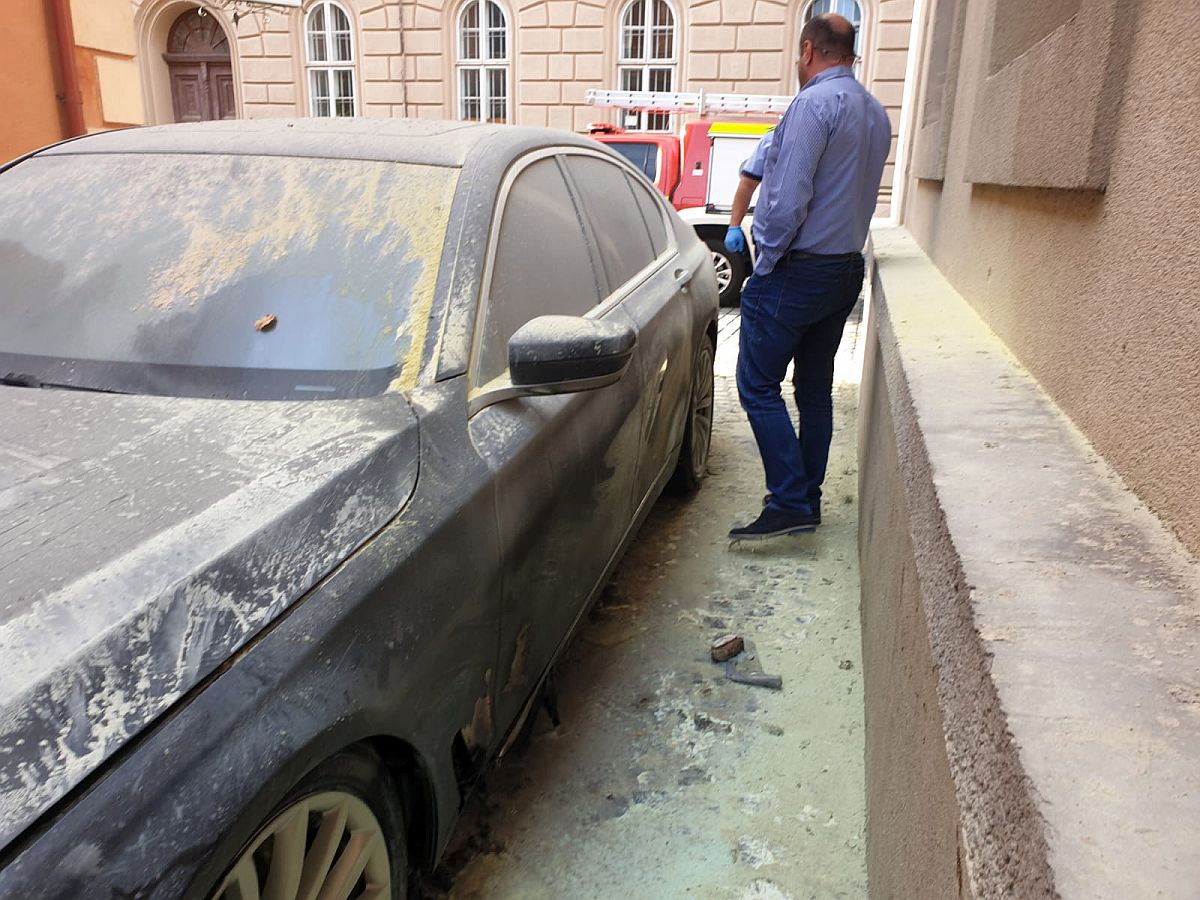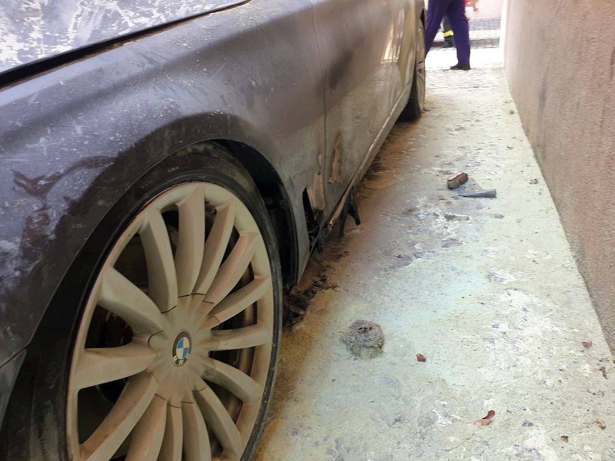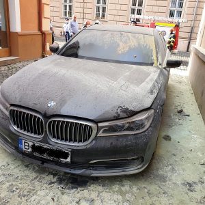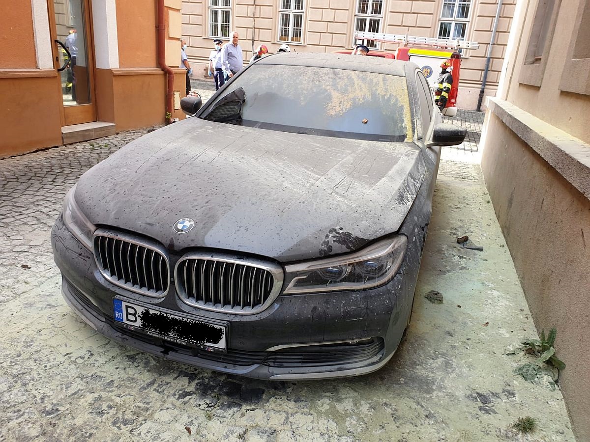 Este vorba de un BMW seria 7 care aparține avocatului Carin Antonescu, autoturismul fiind parcat în zona pietonală de lângă Palatul Dicasterial. Un martor ocular spunea că a auzit alarma mașinii și se pare că de la acel circuit a luat foc mașina, din zona portierei de pe partea șoferului, spre roată.