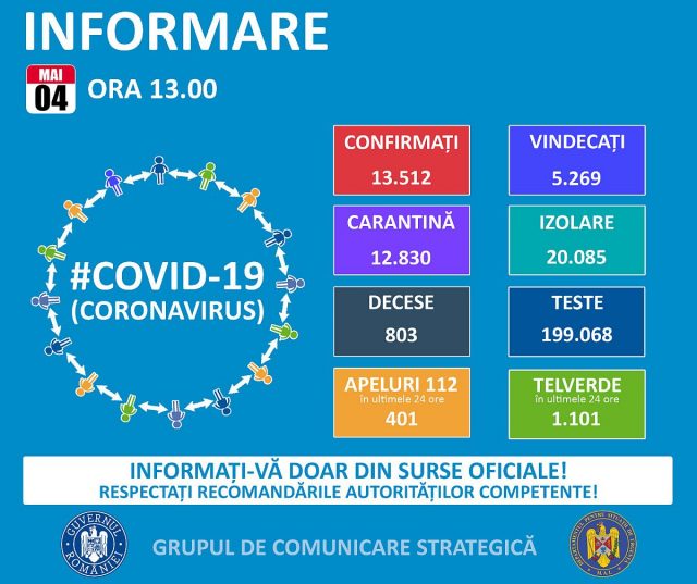 „Până astăzi, 4 mai, pe teritoriul României, au fost confirmate 13.512 de cazuri de persoane infectate cu virusul COVID – 19 (coronavirus).