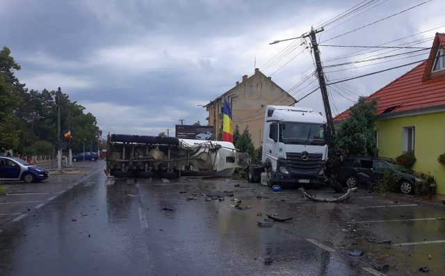 Accident de circulație astăzi, la amiază, în localitatea arădeană Seleuș. În urma impacutlui cu un autoturism, o basculantă s-a răsturnat și a lovit alte trei mașini.