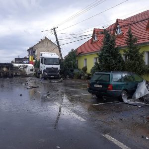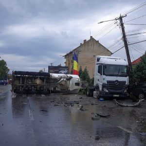 Accident de circulație astăzi, la amiază, în localitatea arădeană Seleuș. În urma impacutlui cu un autoturism, o basculantă s-a răsturnat și a lovit alte trei mașini.
