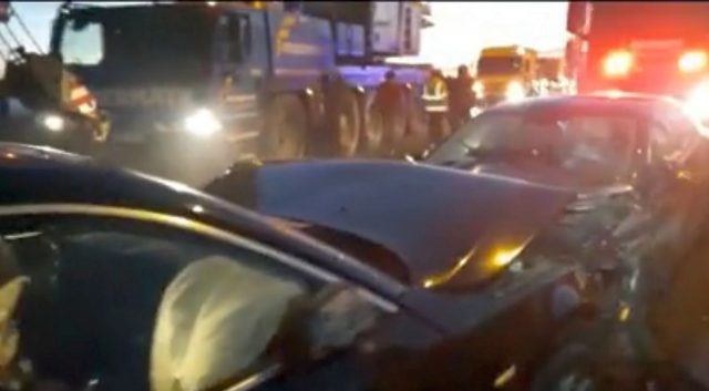 Conform polițiștilor, a avut loc o coliziune în care au fost implicate 10 autoturisme, posibil pe fondul unui carosabil alunecos.