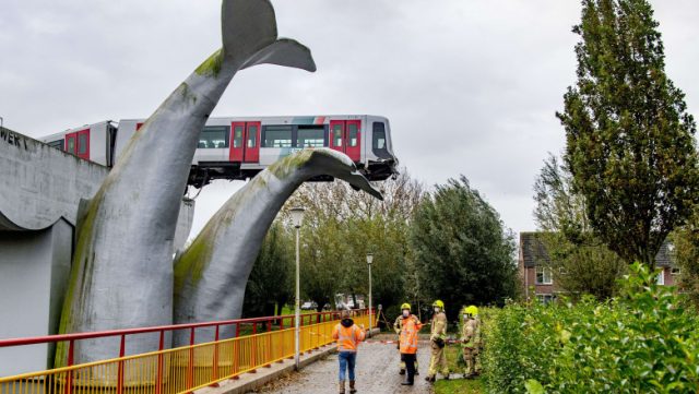 Imagini inedite au fost surprinse în apropiere de Rotterdam, Olanda, acolo unde un tren care a deraiat și care s-ar fi prăbușit în apă, de la o înălțime de 10 metri, a rămas suspendat în sculptura care înfățișează o coadă de balenă în mărime naturală.