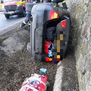 O mașină s-a răsturnat în această dimineață, în jurul orei 10.00, pe DN6, șoseaua care leagă Caransebeșul de Orșova, pe raza localității cărășene Domașnea.