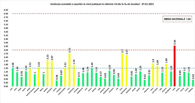 Localitățile cu rata de infectare pe ultimele 14 zile peste 1,5/1.000 locuitori sunt: Lugoj – 2,50; Buziaș – 2,22; Gătaia – 2,10; Jimbolia – 2,59; Sânnicolau Mare – 2,27; Banloc – 2,58; Becicherecu Mic – 2,39; Belinț – 1,58; Cenad – 1,66; Cenei – 1,65; Coșteiu – 2,53; Curtea – 1,55; Denta – 1,85; Găvojdia – 2,40; Giarmata – 2,15; Gottlob – 1,50; Jebel – 1,73; Iecea Mare – 2,04; Lenauheim – 2,35; Orțișoara – 1,69; Peciu Nou – 2,46; Periam – 2,78; Pesac – 1,64; Pișchia – 2,70; Racovița – 2,95; Sacoșu Turcesc – 1,70; Saravale – 1,97; Sânpetru Mare – 1,96; Topolovățu Mare – 1,51; Tormac – 1,70; Traian Vuia – 2,21.