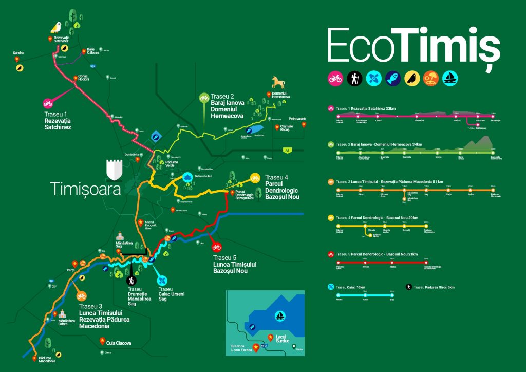 Trasee mai grele sunt de la Timișoara la Buziaș și Silagiu, prin pădure, ori spre Giarmata, Bencecu de Sus, Ianova, Remetea Mare și Ghiroda. Există și trasee care ocolesc Timișoara, cum ar fi cel prin Dumbrăvița, Giarmata, Pișchia și Bordoș, ușor de străbătut, sau cel care pornește de pe marginea canalului Bega și, prin Bazoșu Nou, continuă pe malul Timișului, spre Uliuc și Urseni.