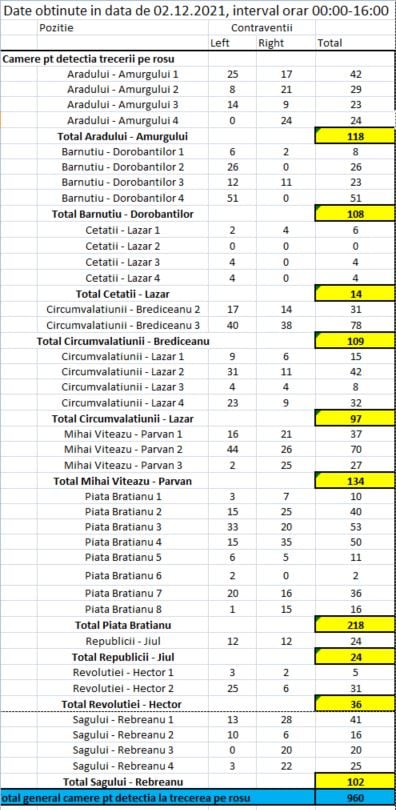 Conform edilului, sunt 10 intersecții supravegheate de 37 de echipamente, în medie sunt 1.500 de treceri pe roșu pe zi în aceste intersecții din tabel.