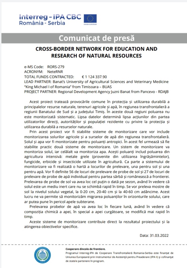 monitorizarea solurilor agricole și a surselor de apă din regiunea transfrontalieră.