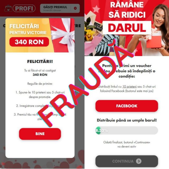 Sub pretextul posibilității de a câștiga un premiu de 340 RON după completarea unui chestionar, utilizatori din România primesc în aceste zile pe social media sau aplicații de mesagerie mesaje cu link-uri către site-uri de phishing.