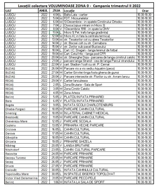 Cetățenii din localităţile menţionate mai sus pot depune prin aport voluntar și gratuit deșeurile voluminoase în containerele special puse la dispoziție în punctele de colectare și între orele menționate în tabelul de mai jos.