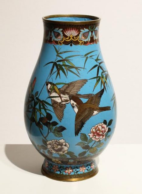 Vaza din colecția muzeului arădean, prezentată de muzeograful dr. Ioan Paul Colta, este realizată în stilul Owari, specific manufacturilor din Ama și Nagoya. Decorul amintește de gravurile din genul kachō-ga (imagini cu păsări și flori) ale lui Andō Hiroshige și Katsushika Hokusai, doi dintre marii maeștri care au abordat această temă. Partea inferioară și cea superioară a vasului sunt decorate minuțios cu motive florale. Centrul de interes îl reprezintă însă pentru privitor zona mediană unde, pe un fundal albastru cobalt, se profilează, într-o manieră stilizată, patru vrăbii, trei surprinse în zbor, printre frunze de bambus, iar o a patra așezată pe o creangă. Bambusul este planta cu care de altfel această pasăre a fost cel mai adesea asociată în imagistica niponă. Eleganța lujerilor de bambus a fost sporită și prin inserarea în compoziție a unor grațioase flori de bujor.