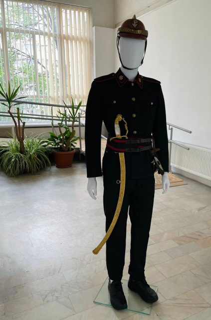 Obiectul lunii septembrie la Muzeul Banatului Montan Reșița este un costum de pompier alcătuit din veston, pantalon și caschetă. Costumul are culoare bleumarin, cu inserții și petlițe roșii, iar cascheta are tot culoare roşie, cu baretă decorativă aurie din metal, având la punctele de inserţie capete de lei în relief și litera P, realizată din alamă prelucrată la cald, dispusă frontal. Toporul de la costumul de paradă al pompierilor are mâner din lemn lăcuit, negru, iar corpul acestuia este cromat, cu tăişul ascuţit și cu o curea din piele neagră. Sabia de la costumul de paradă prezintă o lamă din oţel, uşor curbată, cu teacă şi apărătoare din alamă, cu ornamente vegetale în relief. Pe mâner este reprezentat vulturul bicefal şi capul zeiţei Atena, iar plăselele sunt realizate din sidef alb.