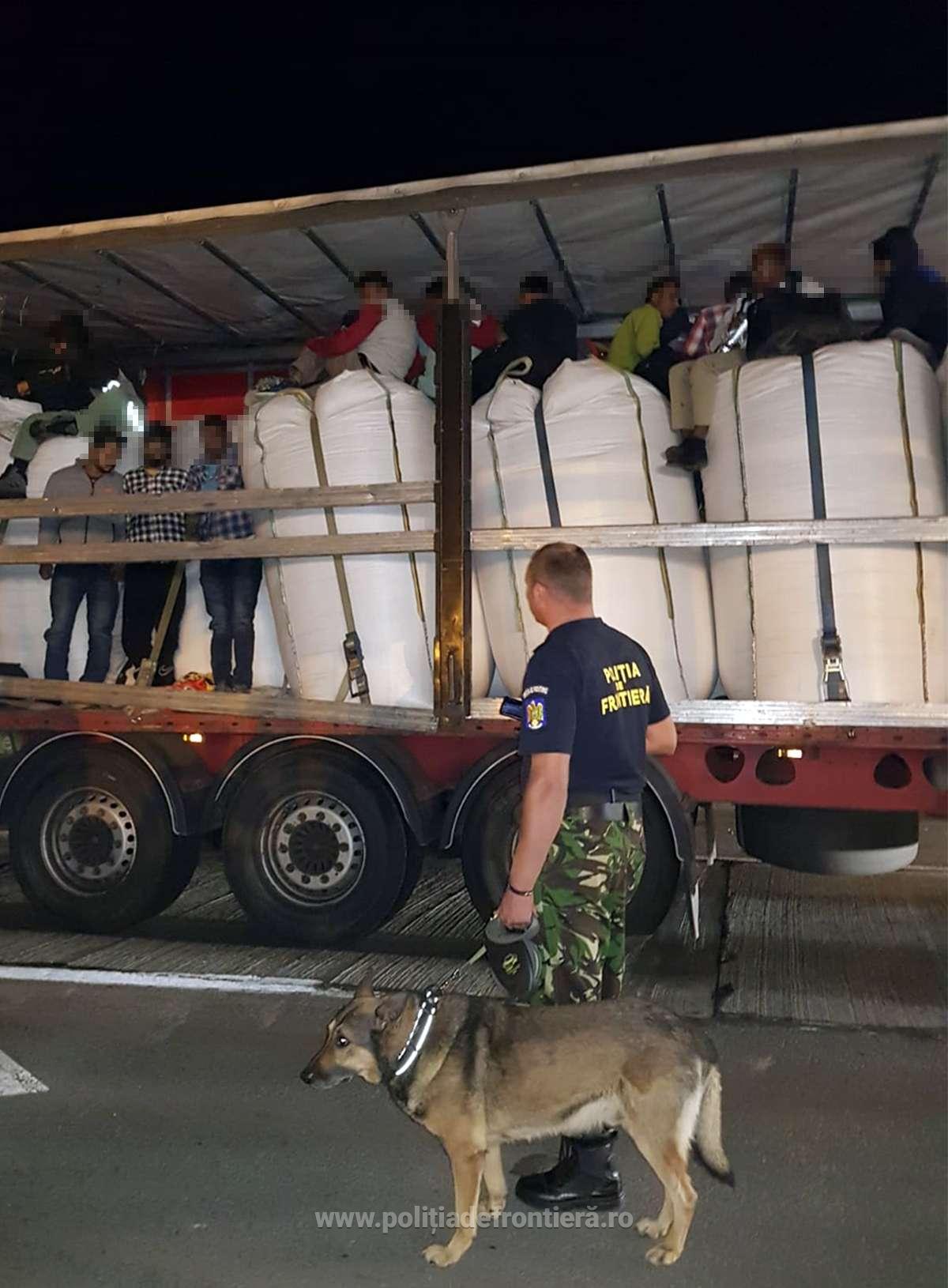 Astfel, la Punctul de Trecere a Frontierei Nădlac II, s-a prezentat pentru efectuarea formalităţilor de frontieră, joi, pe sensul de ieşire din ţară, un cetăţean român, aflat la volanul unui ansamblu rutier înmatriculat în România. Șoferul transporta, conform documentelor de însoţire a mărfii, obiecte sanitare și cereale pentru o societate comercială din Italia. În urma efectuării controlului automarfarului, câinele de serviciu a semnalat prezența unor persoane în mijlocul de transport. Astfel, poliţiştii de frontieră au deschis compartimentul pentru marfă, iar în interior au fost descoperiți 45 de cetăţeni din Bangladesh, India și Pakistan, cu vârste cuprinse între 20 şi 47 de ani. Cei în cauză au intrat legal în ţara noastră în baza unor documente valabile şi intenționau să treacă ilegal frontiera de stat cu scopul de a ajunge în ţări din vestul Europei.