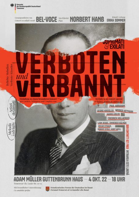 Casa Adam Müller Guttenbrunn găzduiește în data de 4 octombrie, în organizarea Consulatului German din Timișoara, concertul „Suprimați-Exilați”, susținut de soliștii vocali BelVoce din Germania, cu lucrări ale unor compozitori urmăriți și defăimați de naziști.
