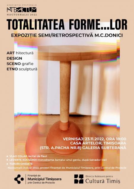 Câteva zile mai târziu, miercuri, 23 noiembrie, un demers artistic special, intitulat „TOTALITATEA FORME…LOR: ARThitectură, DESIGN, SCENOgrafie, ETNOsculptură” – o expoziție semi/retrospectivă realizată de Mihai C.Donici, va fi vernisată, începând cu ora 18:00, în galeria Subterana.