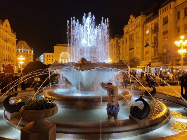 Un bărbat a decis, aseară, să transforme proaspăt inaugurata Fântână cu Pești din centrul Timișoarei în piscină.