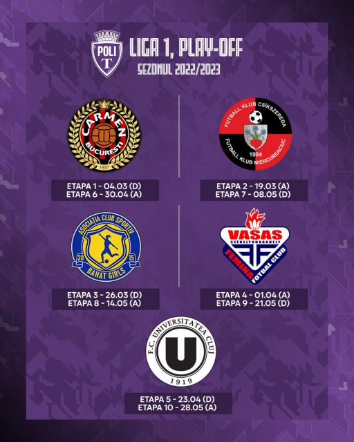 Politehnica Femina își știe programul din play-off-ul Ligii I. Liderele alb-violete încep anul cu un duel în deplasare la Carmen Bucureşti. Derby-ul de pe teren propriu, din ultima etapă, cu „U” Cluj, ar putea fi decisiv pentru titlu.
